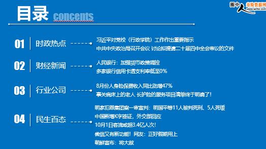 每日新闻速递 2025年9月30日 星期二 目录 时政热点 财经新闻 行业公司 民生百态 习近平对党校(行政学院)工作作出重要指示 中共中央政治局召开会议 讨论拟提请二十届四中全会审议的文件 人民银行:加强货币政策调控 多家银行信用卡透支利率低至0% 8月份人身险保费收入同比劲增47% 事关病床上的老人 长护险的服务项目清单终于明确了! 明家犯罪集团案一审宣判:明国平等11人被判死刑、5人死缓 中国新增K字签证,外交部回应 10月1日客流或超3.4亿人次! 微信又有新功能!网友:正好假期用上 朝鲜宣布:将大赦 时政热点 习近平对党校(行政学院)工作作出重要指示 2025年09月28日 19:30 来源:环球网 中共中央总书记、国家主席、中央军委主席习近平近日对党校(行政学院)工作作出重要指示指出,党的十八大以来,各级党校(行政学院)深入贯彻落实党中央决策部署,认真履职尽责,不断提高教学科研质量,各项工作取得新进展新成效。 习近平强调,新征程上,各级党校(行政学院)要坚持以新时代中国特色社会主义思想为指导,坚持党校姓党,牢记党校初心,更好为党育才、为党献策。要深化教学改革,突出党的理论教育、党性教育和履职能力培训,增强教育培训的针对性实效性。要加强党的创新理论体系化学理化研究阐释,发挥好智库作用。要坚持从严治校、质量立校,加强干部和教师队伍建设,加强对学员的管理监督,着力提高办学治校水平。各级党委要加强组织领导,整合资源力量,强化支持保障,推动新时代党校(行政学院)事业高质量发展。 中共中央政治局召开会议 讨论拟提请二十届四中全会审议的文件 2025年09月29日 14:30 来源:澎湃新闻 中共中央政治局9月29日召开会议,研究制定国民经济和社会发展第十五个五年规划重大问题。中共中央总书记习近平主持会议。 会议决定,中国共产党第二十届中央委员会第四次全体会议于10月20日至23日在北京召开。 中共中央政治局听取了《中共中央关于制定国民经济和社会发展第十五个五年规划的建议》稿在党内外一定范围征求意见的情况报告,决定根据这次会议讨论的意见进行修改后将文件稿提请二十届四中全会审议。