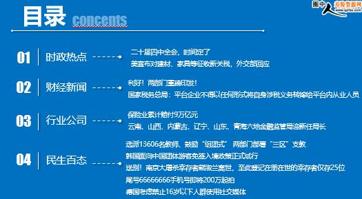 每日新闻速递 2025年10月1日 星期三 目录 时政热点 财经新闻 行业公司 民生百态 二十届四中全会,时间定了 美宣布对建材、家具等征收新关税,外交部回应 利好!两部门重磅印发! 国家税务总局:平台企业不得以任何形式将自身涉税义务转嫁给平台内从业人员 保险业累计赔付9万亿元 云南、山西、内蒙古、辽宁、山东、青海六地金融监管局迎新任局长 选派13606名教师、鼓励“组团式” 两部门部署“三区”支教 韩国面向中国团体游客免签入境政策正式试行 送别!南京大屠杀幸存者熊淑兰离世,至此登记在册在世的幸存者仅存25位 尾号66666666手机号即将200万起拍 德国考虑禁止16岁以下人群使用社交媒体 时政热点 二十届四中全会,时间定了 2025年09月29日 14:25 来源:财联社 据央视新闻,中共中央政治局9月29日召开会议,研究制定国民经济和社会发展第十五个五年规划重大问题。中共中央总书记习近平主持会议。会议决定,中国共产党第二十届中央委员会第四次全体会议于10月20日至23日在北京召开。中共中央政治局听取了《中共中央关于制定国民经济和社会发展第十五个五年规划的建议》稿在党内外一定范围征求意见的情况报告,决定根据这次会议讨论的意见进行修改后将文件稿提请二十届四中全会审议。 美宣布对建材、家具等征收新关税,外交部回应 2025年09月30日 15:25 来源:财联社 据澎湃新闻,外交部发言人郭嘉昆主持例行记者会。路透社记者提问,美国总统特朗普宣布对进口建材、橱柜、浴室用品、梳妆台以及软垫家具征收新的关税。外交部对此有何评论? 对此,郭嘉昆表示,“关税战、贸易战没有赢家,搞保护主义没有出路。”