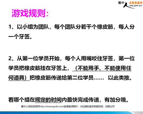 保险团康活动游戏 舞动红唇 道具: 牙签、橡皮筋 10分钟 时间:游戏规则: 1、以小组为团队,每个团队分若干个橡皮筋,每人分一个牙签。 2、从第一位学员开始,每个人用嘴咬住牙签,第一位学员把橡皮筋挂在牙签上,(不能用手、不能使用任何道具)把橡皮筋传递给第二位学员……以此类推。看哪个组在规定的时间内最快完成传递,有加分哦。 踩报纸 游戏规则: 1、以小组为团队,每个团队分一张报纸; 2、小组成员听到裁判员喊“开始”,所有人全部站到报纸上,不能越出界限哦。成功的小组进入下一轮。第二轮时,请将报纸对折,依旧所有成员都站到报纸上,成功的小组可进入第三轮。依此类推,将报纸再对折…… 看哪个小组坚持到最后,有加分哦。 想说点什么…… 感悟 体现一种相互配合的默契、团结的力量团队的精神是让我们团队的所有成员朝着一个共同的目标,互相配合,协同作战成功的团队不是靠团队,而是靠团队中的每一个人,只有大家相互配合、共同努力才能赢得最终的胜利。 抢占先机才会赢得胜利!