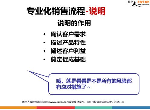 保险专业化销售的优势及其流程 课程大纲 为什么要提倡专业化赢在专业化销售流程 七嘴八舌说保险 保险与一般商品有什么不同? 保险与一般商品的区别 保险无形,一般商品有形保险不能试用,一般商品可以体验保险买的是未来,一般商品买的是现在一起走进保险 专业化销售流程 课程大纲 为什么要提倡专业化赢在专业化销售流程专业化销售流程图 专业化销售流程图 准客户开拓 售后服务 促成 说明 接触 计划与活动 接触前准备 专业化销售流程-计划与活动 目标:寻找旅行社、设定目的地过程:设计行程路线、计算费用活动:实施旅游出行 促成 如果我们打算去旅游你接下来要做什么? 专业化销售流程-计划与活动 制定目标 安排活动 收入目标业绩目标发展目标 安排约访安排拜访量(每日,每周)安排线路图(统筹规划)
