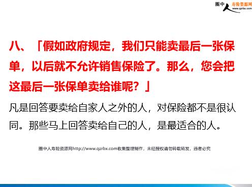 决定性面谈模拟演练话术 一、「您现在从事什么工作?」这是一句非常有用意的问话,即便主管已经看到面试表上新人填写的工作性质,也要像没有看到一样。这样一问,新人一般都会回答出我们真正想要了解的东西,比如现在是否有工作、辞工有多长时间了,等等。一般来说,辞工呆在家里超过一年时间的人,除非其他方面的条件非常适合,否则不予录用为好。 二、「孩子几岁了?一定很聪明,学习成绩很好吧?那一定是您辅导有方!孩子在哪所学校上学?要不要您接送?您是否和您的父母一起居住呢?」这些家常话,蕴含着很深的用意,就是要了解新人在孩子身上是不是牵扯太多的精力,尤其是女性,牵扯的精力过大,上岗以后一般没有办法安心工作,也会给管理工作带来麻烦。 三、「您先生是做什么工作的?什么职位?收入如何?您到这里来应聘有没有和他打招呼?他怎么说?」了解新人家庭状况、人脉关系、收入状况,判断新人对收入的渴求程度,家庭对她从事保险的认同度,将来对她工作的支持度会有多高,能不能帮助她进行转介绍,等等。如果新人没有和丈夫商量过,或商量的结果不是很支持,那么她将来很可能因为家人的反对而中途脱落。如果新人说丈夫无所谓,或者他不管我,说明她在家庭里很有地位,有自主能力。 四、「您为什么要离开目前的工作单位呢?」通过了解新人离开目前单位的原因,可以判断出很多东西。如果对收入不满意,说明她有很高的收入企图;如果对领导不满意,说明她可能是个问题分子;如果对领导的评价很尖刻,说明她喜欢挑战权威;如果对工作前途不满意,说明她很有头脑,将来有可能成为一名主管,等等。 五、「在以前的工作中,您觉得最快乐的事情是什么?您觉得最不快乐的事情是什么?」通过新人对这些事情的描述,去发现她的心理状况,是乐观向上的,还是消极阴暗的?尤其要判断其人际关系的处理能力。 六、「您有哪些优点?有哪些缺点?」如果新人回答的优点很多,可能她确实有很多的优点,很有自信心;如果应聘者回答的缺点很多,一方面说明她可能真的有这么多缺点,另一方面也说明她能够正确地认识自己;如果应聘者说不出自己有哪些缺点,她可能比较自大,以后工作中遇到困难很可能就会退缩,所以不予录用为好。 七、「您和某某增员人、是怎么认识的?」询问新人和增员人之间的关系,一方面是了解新人的来源,另一方面是要发现,增员人是否把新人像拉壮丁一样拉过来的。如果真是随便拉来的,那么主管就要花费更多时间来和新人作深层次的沟通。最好的做法是干脆把新人退回区主任那里,让区主任给新人详细讲解行业前景、公司和区域收展制、收展员工作性质等等。 八、「假如政府规定,我们只能卖最后一张保单,以后就不允许销售保险了。那么,您会把这最后一张保单卖给谁呢?」凡是回答要卖给自家人之外的人,对保险都不是很认同。那些马上回答卖给自己的人,是最适合的人。 九、「按照正常的思维,您取得保险销售资格后,马上会找亲戚和朋友去推销。本来您以为只要跟他们介绍保险,他们马上就会在您这里购买,但事实上,您和他们一谈保险,他们的态度可能会发生一百八十度的大转弯,甚至会说:你来我这里谈什么都行,就是不要谈保险,否则我们连朋友都做不成了。如果真的遇到这种事情,请问您怎么办?」回答以后不再找他们的新人,最好不予录用;回答那我就不和他们谈保险,继续和他们交往,利用机会渗透风险意识的新人,很懂得如何和客户打交道,同时也说明她有一定的心理承受能力。 十、「像您这样优秀的人才,我相信您到任何一家其他的保险公司,他们都会马上录用您,但是我们公司却并不一定是这样的。」对于合适的新人,尤其是优秀的新人,主管一定要懂得以退为进,要把收展与营销的区别、公司对收展员的严格要求等,夸大其词讲给新人听,故意吓唬她,看看她是否知难而退。