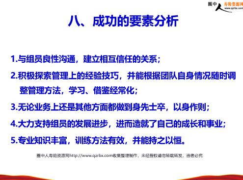 如何成为优秀收展区主任 一、如何成为优秀收展区主任 做人、做事两全其美,人际关系与知识技能兼备,至诚的心,务实的作为,必然胜任愉快! 二、应具备的修养 做人:急公好义,善良热诚,不畏烦劳,受人尊敬。做事:专精内行,迅速准确,冷静周延,条理分明。 收展业务的发展,“人”是决定性的因素,而收展区主任是收展体系最重要的干部,是组员的表率,言行举止,影响至大。 1.专业技能:培养业务力、组织力、亲和力、企划力、推动力等技能,触类旁通,技能愈多,愈能妥善处理事务。 2.主持会报:各种会报是主任展现才华的舞台,应充分发挥所长,会说,会教,会唱,会演。 3.开展培训:对各项专业知识(商品条款、话术、拒绝处理……)及实务技能,深入研究,高效传承。 三、应具备的管理要素 4.育成新人:人才的育成是单位与个人生存之道,协助新人顺利转正,并能长久留存和发展。 5.做好活动管理:了解组员动态,对参加各项会议和培训状况、日志填写、卡片建立、基本活动、情绪波动等确实把握,并对必要人员予以协助和指导。 6.提升关键指标:不断提升组员与收展区的各项业务指标和经营效率。 7.营造职场和谐的气氛:士气的维护、人性的激励、奖励与表扬、协调与沟通、问题的解决,都是一种艺术的表现。 依法行事用心服务 四、记经营哲学 五、大事须注意小节 细节决定成败,小节折射品格 1.始终保持精神抖擞,仪容整洁; 2.公正公平,一视同仁,勿令人有偏心之感; 3.勿与某些组员特别亲近而影响单位团结; 4.藏得住苦,要报喜不报忧(对组员); 5.冷静解决突发事件; 6.要有数字观念,牢记单位内重要的数字; 7.与同仁亲和而不轻浮; 8.酒勿过量,宴席中言行不失态; 9.勿有非分男女之情(职场大忌); 10.不要陷入借贷纠葛; 11.私生活应越单纯越好; 12.不可与同仁涉足不良嗜好; 13.勿使人当场下不了台而结怨树敌; 14.上班、组织活动、与人约会要守时。 请列举你经历的主管中,有在经营中成功或失败的例子。 六、研讨 现实中的成和败的例子比比皆是。就收展区主任成功与失败而言,观念和方法正确与否决定结果,而且结果大不相同。 1.对组员的需求不研究,不敏感; 2.对基本管理技巧不听、不学、不掌握,不会更新改进经营管理方法; 3.傲慢自大,忘乎所以,把自己当成“官”; 4.不是考虑自己能为组员做什么,而是考虑组员能给自己带来什么; 5.增员不加选择,不会训练和辅导新人,导致组员不能胜任,增加管理难度,整体失控,团队涣散。