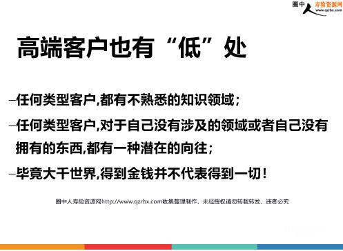 保险销售之建立面对客户的心理优势 高端客户也有“低”处 任何类型客户,都有不熟悉的知识领域;任何类型客户,对于自己没有涉及的领域或者自己没有拥有的东西,都有一种潜在的向往;毕竟大千世界,得到金钱并不代表得到一切! 常见3类客户 弱势项目的分析与对策 扬己之“长”,攻彼之“短”,在客户不熟悉的领域展示自己的专业,就能快速建立专业形象(权威) 第1类-从事投资的客户 分析由于长期从事贸易投资和资本运作,对团队管理或商务行政比较薄弱。 对策:先低后高 1.赞美、寒暄、高估他; 2.发问请教对方弱势之处,建立业务员专业形象。第1类-从事投资的客户 第2类-白手起家的商人 分析未进大学深造,机会造就成功。对有识人才有一种潜在的崇敬感。渴望高素质朋友的友谊和尊重 对策:成为良师益友 1.根据其学识稍低和性格特质,代理人反而更应讲究着装的品味和学识的沉淀,建立自身的专业形象; 2.以诚相待,建立信赖。 第2类-白手起家的商人 第3类-经营实体的企业主 分析由于工作性质和工作时间原因,对资本市场(股票、债券、基金等)关注度不高,投资知识有所欠缺; 专业人士必须具有: 谦虚的素质和骄傲的气质 专业赢得未来自信铸就辉煌 谢谢 ...........
