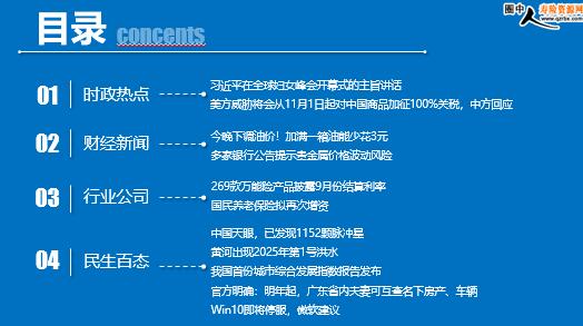 每日新闻速递 2025年10月14日 星期二 目录 时政热点 财经新闻 行业公司 民生百态 习近平在全球妇女峰会开幕式的主旨讲话 美方威胁将会从11月1日起对中国商品加征100%关税,中方回应 今晚下调油价!加满一箱油能少花3元 多家银行公告提示贵金属价格波动风险 269款万能险产品披露9月份结算利率 国民养老保险拟再次增资 中国天眼,已发现1152颗脉冲星 黄河出现2025年第1号洪水 我国首份城市综合发展指数报告发布 官方明确:明年起,广东省内夫妻可互查名下房产、车辆 Win10即将停服,微软建议 时政热点 习近平在全球妇女峰会开幕式的主旨讲话 2025年10月13日 15:42 来源:新华社 10月13日上午,国家主席习近平在北京国家会议中心出席全球妇女峰会开幕式并发表主旨讲话。 习近平指出,妇女是人类文明的重要创造者、推动者、传承者,推进妇女事业发展是国际社会的共同责任。30年前,北京世妇会确立“以行动谋求平等、发展与和平”的崇高目标,通过了具有里程碑意义的《北京宣言》和《行动纲领》,将性别平等刻入时代议程,激励全世界的人们为之接续奋斗。30年来,在北京世妇会精神指引下,全球妇女事业蓬勃发展,为人类文明进步增添了亮丽色彩。追求男女平等已经成为国际社会普遍共识,妇女赋权取得显著进步,女性受教育水平不断提高,在经济、政治、文化、社会生活中发挥着更加重要的作用。一大批杰出女性走上国际舞台,演绎精彩人生、贡献智慧力量。 美方威胁将会从11月1日起对中国商品加征100%关税,中方回应 2025年10月13日 15:42 来源:环球网 外交部发言人林剑主持10月13日例行记者会。会上法新社记者提问称:特朗普当地时间10日表示,针对中方采取的稀土等相关物项出口管制,美国将会从11月1日起对中国商品加征100%关税,中方对此有何评论? 中方对自美进口商品是否会征收新的关税? 林剑对此表示,中国商务部发言人已经就此阐明了中方的立场。我要强调,近一段时间来,美方持续出台一系列对华限制和制裁措施,严重损害中方利益。中方对此坚决反对。 林剑称,美方不仅没有反躬自省,反而以高关税相威胁,这不是同中方打交道的正确方式。中方敦促美方尽快纠正错误做法,以两国元首通话重要共识为引领,在平等尊重和互惠基础上,通过对话解决各自关切,妥善管控分歧,维护中美关系稳定、健康、可持续发展。如果美方一意孤行,中方也必将坚决采取相应措施,维护自身正当权益。
