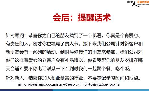 保险晋升表彰大会的意义流程及其话术与注意事项 背景及意义 流程介绍 课程大纲 话术训练与注意事项 对于新人伙伴以及主管来说,最好的成长就是晋升,通过机制化增员模式达成周转正、月过万、季晋升,更应该给晋升人员一种万众瞩目的“感觉”。而一场高规格、高品质的主管晋升表彰大会更是对晋升人员的最好激励。千人会场、顶级音响 T台走秀、舞台灯光 高品质会议顾问/准新人晋升表彰(创业)大会 顾问:至爱亲朋准增员对象:25岁—45岁、大学生、全职太太、其他销售行业成功人士…... 1+1/1+1+1参会模式 1+1参会模式 主管晋升表彰大会对于新人伙伴来说是一次很好的激励,同时对于顾问以及准新人来说也是一次良好的感官刺激,从而促使顾问开始转介绍的动作或促使准新人做出加盟xx的决定。 背景 流程介绍 课程大纲 话术训练与注意事项 暖场节目表演——唱歌/晨操致欢迎辞 T台走秀感恩分享(晋升人员采访)领导致辞视频创业专题个人分享目标规划爱心传递、现场报名 主管晋升表彰会流程 主管晋升表彰大会 致欢迎辞 T台秀 微信互动
