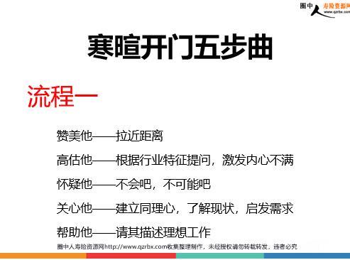 面谈前的准备及二五增员法 25法的设计思路 和销售面谈一样,增员面谈也是以需求点为出发点,并始终围绕需求点进行增员面谈必须充分考虑和利用高素质增员对象的择业心理 增员面谈前的准备要项 自我准备自信的心态骄傲的气质谦虚的态度着装修饰增员工具:公司简介、荣誉证书、工资条、学习的理念 增员面谈前的准备要项 熟练讲解至少20条行业公司的卖点,至少有一条能打动对方 无创业成本,无风险垂直成长(培训机会) 自然加薪(20—30%) 个性修炼(感恩、包容、换位思考……) 例: 针对不同人生阶段,找到对方担忧和需求了解不同行业的优势和突破点,预估可能的拒绝问题 二五增员面谈流程图 流程一 寒暄开门五步曲 赞美他——拉近距离高估他——根据行业特征提问,激发内心不满怀疑他——不会吧,不可能吧关心他——建立同理心,了解现状,启发需求帮助他——请其描述理想工作 流程二 说明 自我转行的心路历程转折句:我当初也有你这样的想法解决对方的疑惑和担忧行业优势20点中选择性的讲解 流程三 流程三 激励促成 促成再次高估他,肯定他处理拒绝问题针对他的困惑,介绍行业、公司、团队、文化、自我成长、工作内容 流程四 推拉两“度” 增员促成 推:以要求为主拉:告知其招聘流程,了解后才作最后决定。 介绍引进流程,适“度”推拉 参加说明会(拉) 参加面试(推) 训前培训(推/拉) 参加新人考试(推) 通关考试(推) 作出选择