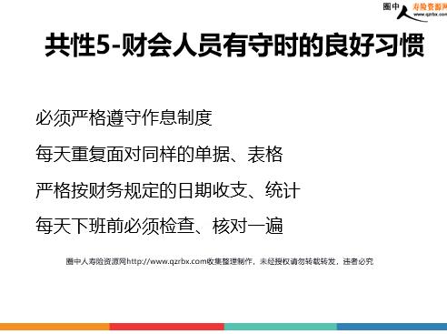 适合做保险的财会人员 适合做保险的人 ——财会人员 一定能做好保险吗?愿意来做保险吗? 共性1-财会人员责任心强 对待繁琐的数据要认真、仔细每一笔账目都要登记,绝不能有差错每天都跟数字打交道,不能情绪化做事情金额差错要由自己赔上出现数据对不上的地方必须要有耐心、有忍耐力,反复核对 财会人员的8个共性—— 共性2-财会人员有足够的沟通能力 要经常跟票证不符合财务要求的人员沟通要跟银行、工商、税务部门的人员沟通对不同的对象要用不同的沟通方式,说不同的话还要考虑到单位的人际关系以及部门间的关系协调 共性3-财会人员能承受压力 经常被迫打“擦边球”,甚至做不合规的事情,内心惶恐处理现金有风险坚持原则有时还被别人埋怨,甚至指责工作枯燥、单调,收入低工作时间普遍超长,节假日加班现象普遍在私营企业中从事财务工作,很难坚持财务原则为了应付检查常常被迫加班对企业财务状况知情越多,自身风险越大现有职位容易被剥夺,前途掌握在别人手中 共性4-财会人员学习能力强 必须不断掌握新的专业知识和相关法规、制度需要不断自费参加继续教育 共性5-财会人员有守时的良好习惯 必须严格遵守作息制度每天重复面对同样的单据、表格严格按财务规定的日期收支、统计每天下班前必须检查、核对一遍 共性6-财会人员具有计划、总结和详细记录的习惯 每天要处理的事情很多、很杂当日事情当日完成领导对预算、控制要求高每天都要记录、整理、核对每笔收支都要有明细,这是要求和习惯需要按月、季、年编制财务报告 共性7-财会人员有追求成长的强烈愿望 多年来的重复性劳动,使人产生强烈的倦怠感和危机感没有成就感,潜在风险巨大晋升机会极少,担心自己的未来 共性8-财会人员强烈需要自主发展 自己的付出与回报非常不成比例很多人不安于现状,厌倦这种枯燥和被动的工作渴望凭能力发展,需要实现自己的价值 结论 财会人员在工作中长期形成的特质,决定了他们在寿险业容易取得成功! 工作模式比较 工作模式比较 财会人员