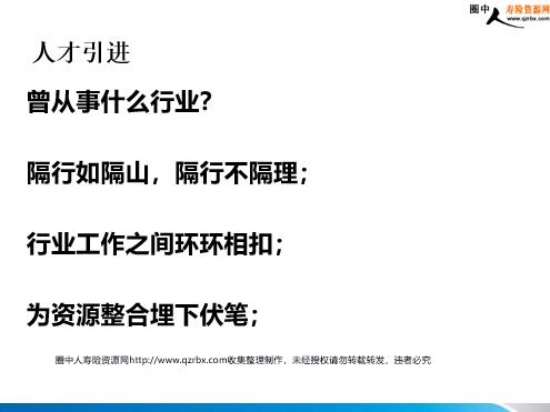 保险团队建设之人才引进日常管理及资源整合 目录Contents 团队建设—人才引进 团队建设—日常管理 团队建设—资源整合、业务开拓 团队建设—意义 团队建设的重要性:达成团队伙伴之间的共识及加强合作力度;更有效的管理;更好的决策,更好的执行;提高伙伴主动学习的意愿,增强伙伴的信心;使伙伴们拥有凝聚力、团结意识、荣誉感、归属感。 目录Contents 人才引进 (一)曾从事什么行业? (二)为何从事保险行业? (三)自己或家人是否够买保险? (四)目标与规划 人才引进 曾从事什么行业?隔行如隔山,隔行不隔理;行业工作之间环环相扣;为资源整合埋下伏笔; 人才引进 为何从事保险行业?建立正确的价值观; 爱心 前景 时机 other 人才引进 品德为先,适者为才 德才 行业的特殊性造就我们万事皆以品德为先,这是用人及做人的首要原则。司马光总结说,自古以来,国之乱臣,家之败子,才有余而德不足矣。 人才引进 目标规划如同盖大楼前施工图纸一样重要; 看见目标→定制计划→帮助实现 目标规划 人才引进 恭喜你,一生如此的充实 1-3年内完成的目标 1-2个月内完成的目标 5-10年内完成的目标 时间 数量 人才引进 目录Contents 团队建设—人才引进 团队建设—资源整合、业务开拓 日常管理 【每周二次早会】 1)业绩分享:播报业绩,距离目标、奖励方案、转正尚存的差距; 2)签单分享:无论新老伙伴,如有签单,需做签单分享,签单过程中遇到的问题,何如应对解决,是最有价值的信息; 3)新人提问:针对新伙伴的强制性要求,无论签单与否,需在每周二次会议上至少提出两个问题,无论是产品,展业,沟通等问题,并由老伙伴成员一一解答; 4)意见收集:定期收集每一位团队伙伴的日常展业及在公司内所遇到的问题,并及时反映给相关领导,增强队员归属感及认同感; 5)每周五产品培训。