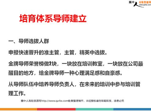 收展新人育成模式落地及导师队伍建设 主要内容 收展新人育成模式如何落地导师队伍的建设实施设想 与收展增员节奏和增员量匹配依托职场训练和主管批量育成,可迅速复制收展新人育成模式的选择 1、培育模式专业、系统、成趋势 2、循环可持续操作,不漏掉一个新人 3、培训内容独立、不断档、可复制性强(户外团康) 4、坚定推荐人增员信心,有利留存 5、培养主管自主经营能力 选择育成体系的理由 主要内容 收展新人育成模式如何落地导师队伍的建设实施设想 1、统一思想、达成共识 2、组建导师团(选择合适导师、人力岗组织导师通课) 3、建立荣誉竞争激励机制 4、包装、宣导育成体系(主管辅导手册增强主管自主经营意识) 5、制定育成体系行事历、职场布置(新人取得门票、师徒协议上墙、课程安排) 培育体系导师队伍建设 6、定期召开育成分析会(周、月经营会上分析新人情况、主管汇报辅导情况、提出有利建议) 7、定期举办结训新人回归团队仪式 8、举办新人推介会、晋升会、顾问联谊会、个人小说会、创业说明会(易留存、利晋升) 主要内容 收展新人育成模式如何落地导师队伍的建设实施设想 一、导师选拔人群二、导师荣誉体系三、导师管理制度四、配套工具 培育体系导师建立 一、导师选拔人群申报快速晋升的准主管,主管,精英中选拔。金牌导师荣誉榜做2块,一块放在培训教室,一块放在公司最醒目的地方,给金牌导师一种心理满足感和自豪感。从导师队伍中培养导师负责人,在未来的培训中参与培训管理工作。培育体系导师建立 二、导师荣誉体系 1、聘成导师后发放导师授权资格证书,发放白衬衫(冬夏各一件),配备导师专属胸牌。 2、参加教师节特别活动,每人准备神秘大礼一份。 3、年末表彰大会,给予最美园丁奖,颁发年度荣誉证书。 4、导师每月额外享受2次展业假。 5、专门职业形象设计,金牌讲师榜展示一年。 6、导师负责人每月奖励30元通讯费。