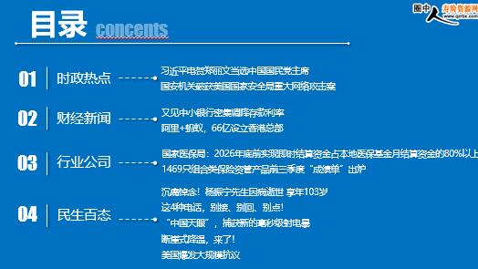 每日新闻速递 2025年10月20日 星期一 目录 时政热点 财经新闻 行业公司 民生百态 习近平电贺郑丽文当选中国国民党主席 国安机关破获美国国家安全局重大网络攻击案 又见中小银行密集调降存款利率 阿里+蚂蚁,66亿设立香港总部 国家医保局:2026年底前实现即时结算资金占本地医保基金月结算资金的80%以上 1469只组合类保险资管产品前三季度“成绩单”出炉 沉痛悼念!杨振宁先生因病逝世 享年103岁 这4种电话,别接、别回、别点! “中国天眼”,捕获新的毫秒级射电暴 断崖式降温,来了! 美国爆发大规模抗议 时政热点 习近平电贺郑丽文当选中国国民党主席 2025年10月19日15:14 来源:央视新闻 中共中央总书记习近平19日致电郑丽文,祝贺其当选中国国民党主席,指出多年来两党在坚持“九二共识”、反对“台独”共同政治基础上,推动两岸交流合作,致力维护台海和平稳定,增进两岸同胞亲情福祉,成效积极。当前,世界百年变局加速演进,中华民族伟大复兴势不可挡。期望两党坚持共同政治基础,团结广大台湾同胞,增强做中国人的志气、骨气、底气,深化交流合作,促进共同发展,推进国家统一,坚定守护中华民族共同家园,守护两岸同胞根本利益,携手开创中华民族更加美好的未来。 国安机关破获美国国家安全局重大网络攻击案 2025年10月19日 08:08 来源:财联社 据央视新闻,近期,国家安全机关破获一起美国重大网络攻击案,掌握美国国家安全局网络攻击入侵中国国家授时中心的铁证,粉碎美方网攻窃密和渗透破坏的图谋,全力守护“北京时间”安全。