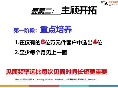 保险高端客户经营销售的四要素 高端突破 要素一、成功信念要素二、主顾开拓要素三、个性化的销售行为要素四、成交后的销售 保险是人类最伟大的发明,是任何产品都无法替代的任何一个人相对保险而言都很渺小未来要给50位亿万富翁做保险服务 要素一:成功信念 1.将资金立即放大100倍 2.安全、有效的传承资产 3.转移由人身风险带来的企业经营风险 深信,高端客户只有通过保险: 观念突破 要素二:主顾开拓 第一阶段:重点培养 1.在仅有的6位万元件客户中选出4位 2.至少每个月见上一面 见面频率远比每次见面时间长短更重要 3.通过轻松聊天的方式融入客户生活 4.观察细节,了解客户所想 发现高端客户不愿转介绍的“形”与“魂”:要面子,不愿开口怕失败,影响交情怕麻烦,不愿费心重隐私,不愿暴露怕误会,从中获利 问题根源: 高端客户对保险的认同度还不够我们要求转介绍的方法有待改进我们没有给他一个迫切的理由 不是高端客户不介绍,而是我们做得不够好! 第二阶段:有效突破 同类转介绍逆向转介绍 两种方法: 同类转介绍定义:让高端客户介绍与他需求一致、财务状况一致的准客户 同类转介绍——3步曲: 第一步:强化老客户对已购买产品的认同度 例:xx就是用最少的资金得到最大的放大效果,您用3万元得到500万的急用现金,而且公司帮您把保费作为养老金在运作,将来平安无事时可以锦上添花 即:每次见面都在不经意间再次复述保单利益 第二步:告诉客户该产品的适用人群 例如:老客户,37岁,结婚不久,x年购买xx万元,保障最高500万告诉客户:现在像你这样年轻、有学历、收入较高也较稳定的人群一般工作压力非常大,而且也会像你这样考虑到人身风险的问题,因为家庭责任也很重。所以像你买的xx也会很适合他们 第三步:提示引导客户做出同类转介绍 即:你周围有没有跟你情况差不多的人? 成功感悟:在请高端客户转介绍时,只做第三步是没有效果的!必须先做好第一步、第二步,再做第三步 逆向转介绍定义:让高端客户介绍比他财务状况高许多的准客户