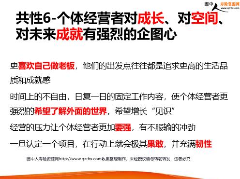 个体经营者群体分析 适合做保险的人 ——个体经营者 一定能做好保险吗?愿意来做保险吗? 我们眼中的个体经营者 自己做老板,很风光想做什么就做什么,不看人脸色不用上下班打卡,时间很自由收入由自己决定,赚钱多不用考虑晋升问题,没有职业天花板共性1-个体经营者习惯于承受压力 每天有固定的房租、人工、税收等费用支出资金压力巨大,流动资金全压在货上 “生意”的持续性非常脆弱,例如选址、拆迁、修路、季节更替等外界客观的小事情,都会严重影响生意的状况,甚至导致关门歇业经营风险不可控,今天赚钱明天亏钱,欠账、坏账多,甚至血本无归 共性2-个体经营者应变能力强,人际沟通能力强,容易被别人认同 要随时应付工商、城管、卫生等各类检查,必须和地方上建立并维持好良好的社会关系员工队伍(俗称打工仔)不易管理、流动性强要直接面对客户,亲自维护客户关系,处理客户抱怨亲自处理业务事务,必须和供应商、销售商、经销商联系紧密,交往密切 共性3-个体经营者比大多数行业更勤奋,更能吃苦 每天工作都有十几个小时,从无节假日和休息日工作风格倾向于亲力亲为,大到融资洽谈,小到现场作业,都需要亲自去做每天工作方式主要就是“坐摊守店”,枯燥单一生意好时容易招惹“嫉妒”,成为被抱怨和被欺负的对象,心理疲惫 共性4-个体经营者自律性强,注重记录与计划 早出晚归,每天准时“出勤”开门营业一天内各时间段的工作内容相对固定,每天的过法都差不多每天都需要记录客户的情况、记录货品进出情况、每天都要记账、对帐因为自主经营的原因,比一般职业更需要做每月、每日的计划 共性5-个体经营者客户意识强,服务意识好 每天都要和客户直接打交道,要为他们提供良好的服务都有“客户是衣食父母”的意识,必须时时刻刻自觉的开拓、经营客户服务是个体经营者的日常工作内容,从而比一般人更了解人性共性6-个体经营者对成长、对空间、对未来成就有强烈的企图心 更喜欢自己做老板,他们的出发点往往都是追求更高的生活品质和成就感时间上的不自由,日复一日的固定工作内容,使个体经营者更强烈的希望了解外面的世界,希望增长“见识” 经营的压力让个体经营者更加要强,有不服输的冲劲一旦认定一个项目,在行动上就会极其果敢,并充满韧性 共性7-个体经营者更加渴望快乐的工作方式和生活方式 反感“商场”的潜规则,希望摆脱不健康的工作和生活方式,包括:恶性竞争手段、地方主管部门的潜规则、没完没了的应酬;合伙人之间的纠纷;没有时间和家人在一起等等除了“赚钱”以外,找不到辛苦付出的社会价值,失落感强烈,某些行业甚至产生负疚感