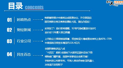 每日新闻速递 2025年10月23日 星期四 目录 时政热点 财经新闻 行业公司 民生百态 特朗普称预计中美将达成贸易协议,外交部回应 国民党新任党主席表态愿赴大陆,国台办回应! 时间定了!油价即将调整,92号汽油或重返6元时代 金价创12年最大单日跌幅 上市险企三季报接连预喜,投资收益大增或推动净利上涨40%~70% 中邮保险注册资本增至约326.4亿元 全国秋粮收获近八成 “十四五”期间 全国地下水超采区面积总体下降 根除幽门螺杆菌,我国科学家给出全新方案! 宇树科技公布新专利,可将人类动作映射至机器人 冰岛首次发现蚊子 时政热点 特朗普称预计中美将达成贸易协议,外交部回应 2025年10月22日 15:32 来源:财联社 据北京日报,10月22日,外交部发言人郭嘉昆主持例行记者会。 法新社记者提问,美国总统特朗普表示,他预计在下周举行的APEC峰会上中美会在贸易问题上达成协议,但他也称中美元首届时未必会见面。中方对此有何评论? 郭嘉昆说,元首外交对中美关系发挥着不可替代的战略引领作用,中美两国元首保持着密切的交往和沟通。 “关于你提到的具体问题,我目前没有可以提供的信息。”郭嘉昆说。 国民党新任党主席表态愿赴大陆,国台办回应! 2025年10月22日 15:07 来源:中国银行保险报 10月22日,国务院台办举行例行新闻发布会。有记者提问:郑丽文表态愿意赴大陆访问交流,请问大陆方面是否欢迎? 对此,发言人朱凤莲表示,要和平、要发展、要交流、要合作是台湾主流民意。我们愿意在坚持“九二共识”、反对“台独”的政治基础上,与台湾各政党、团体和各界人士一道,促进两岸交流合作,推动两岸关系和平发展,为台海谋和平,为同胞谋福祉,为民族谋复兴。我们也愿在既有共同政治基础上,同中国国民党加强高层往来,巩固增进政治互信,保持良性互动,顺应两岸同胞愿望,共同推动两岸关系和平发展,维护台海和平稳定,造福两岸同胞,携手致力民族复兴。 据此前报道,中国国民党10月18日举行党主席选举,候选人郑丽文当选新任党主席。