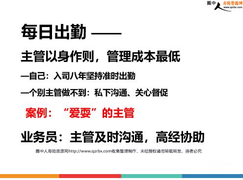 保险团队经营之绩效稳定增长的三个习惯 团队绩效持续稳步增长源于—— 长期坚持做好、做细三件事 每日出勤每日填写工作日志定期整理名单 “习惯”的认识 习惯不是一两次的经历,而是一生都需要去重复的动作卓越就是把习惯做的正确事情,做得更好、更细、更坚持 团队:增员几个与我志同道合、同质的团队骨干 —自律性强、习惯好、观念一致明确用“三个习惯”来管理团队 骨干志同道合奠定团队价值观 三个习惯的具体要求 统一团队行为的关键动作 主管以身作则从新人抓起,植入行为标准—三个习惯建立制度,坚守原则,重在沟通执行好,马上表扬;有偏差,立刻纠正 -选择标准:自律性强、习惯好、易沟通-增员面谈:推荐人到高经层层强调,达成共识(每日出勤、每日5访)-进入职场:签订承诺,推荐人辅导,新人照做 新人的行为标准建立 每日出勤—— 主管以身作则,管理成本最低 —自己:入司八年坚持准时出勤 —个别主管做不到:私下沟通、关心督促案例:“爱耍”的主管业务员:主管及时沟通,高经协助 原则与灵活 —制度不是约束,而是帮助和培养 —换位思考,帮助、协调,督促改进 每日填写工作日志—— 我眼中的工作日志-业务员工作状态的真实反应-主管诊断、辅导和追踪的最佳工具 操作流程 每天早会前助理统一收取登记 主管逐级批改关注拜访量与主管批改状况(高经抽查状态异常员工) 发现问题给出建议提供辅导与陪访 追踪落实持续面谈不断改进 拜访量与目标相匹配 不能坚持-沟通理念,强调团队价值观-加强监督,早会前现场补上自己的工作日志公开,让大家检查主管辅导能力不足-主管周例会交流、辅导 常见问题及处理 最大收获 —带动一大批普通业务员,养成好习惯,提升业绩,形成良好的团队氛围 定期整理名单—— 固定的时间、地点及量化要求-每周末:15个以上-每月26号下午:公司职场,50个以上