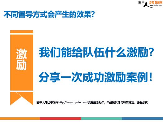 保险营业区业务督导的常用形式及其效果 在营业区 督导的对象与内容是什么? 营业区业务的有效督导 督导 可燃式督导 自燃式督导 可燃式督导具体有那些常用形式? 可燃式督导 由外至内的督导也称可燃式督导,是指通过外界督促、约束等方式由外至内进行改变,进而获得绩效指标良性改变的过程。 不同督导方式会产生的效果? 什么工作需要组织? 良好的组织能带来什么? 不同督导方式会产生的效果? 1.节省工作时间 2.提升工作效率 3.明确工作目标 4.工作系统化 5.任务达成率高 不同督导方式会产生的效果? 营业区有什么训练? 仅仅新人需要训练吗? 不同督导方式会产生的效果? 1.丰富受训者专业知识 2.培养受训者专业能力 3.提升受训者工作效率 4.受训者工作习惯 5.改变受训者思维方式 “七步训练法” 话术解读与记录讲师示范话术背诵上台演练点评一对一演练通关 “三三训练法” 1/3时间讲授 1/3时间演练 1/3时间通关 督导工作中常用的训练法有哪些? 不同督导方式会产生的效果? 1.准确掌握展业信息 2.及时跟进工作进度 3.有效传达工作信息 4.保持良好有效沟通 5.提高目标达成效果 不同督导方式会产生的效果? 1.不断明确工作思路 2.保持正确工作方式 3.正视自身工作成果 不同督导方式会产生的效果? 1.有效的解决工作问题 2.积累宝贵的工作经验 3.形成有效的工作记录 可燃式督导 有什么共同点?
