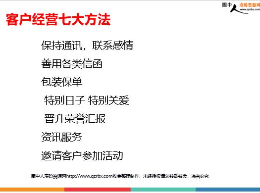 保险客户经营的概述重要性及其具体方法 一、客户经营概述 乔吉拉德的“250定律” “每一个用户的背后都有250个人,促销员若是得罪一个人,也就意味着得罪了250个人;相反,如果促销员能够发挥自己的聪明才智赢得了一个顾客,也就同时得到了250个关系。” ——“世界最伟大的推销员”乔吉拉德(美)自传完整的经济保障 一个客户=一片市场 客户价值 “美国哈佛商业杂志发表的一篇研究报告指出:多次光顾的顾客比初次登门的人可为企业多带来20%--85%的利润。如何让客户多次光顾? ——产品?服务?关系? 销售人员竞争力的来源 市场监管,产品同质化。 服务贴心,口碑传佳话。 关系牢固,经营需创新。 名人名言 关于服务 为一个顾客衷心服务,你肯定会获得100个新的顾客。 ——日本松下电器创始人松下幸之助 关于人际关系 在中国做生意,第一靠关系,第二靠关系,第三还是靠关系。 ——海尔集团董事长张瑞敏 什么是客户经营? 客户是一种资源,通过各种服务的形式与客户之间持续建立着一种信任的关系,并将客户资源进行有效地整合与配置,使之不断地产生新的有效的能量且将这种能量最大限度地释放。二、客户经营重要性 思考一 为什么:在同一家公司销售同样的产品每个人的业绩会不一样? 结论 销售人员的分类: A类:高能力、高资源(专业同时人际关系好) B类:高能力、低资源(专业但是人际关系不好) C类:高资源、低能力一些新人 D类:低资源、低能力一些老员工 能力靠学习和实践资源靠经营和积累 思考二 为什么洪七公能够讨到饭? 为什么我们吃医生给的药?开错药你吃不吃? 答案:1、衣着2、信任医生专业不专业,你知道吗?不知道! 有时候信任比专业更重要! 思考三 客户凭什么跟你买保险? “觉得他这人还不错,讲保险听起来挺有道理的!” 客户购买保险的理由 愉快的感觉认同——你、保险、公司、产品…… 需求的满足问题的解决 准客户分类 A类:很认可你,也很认可保险; B类:很认可你,但不认可保险;(比如买过保险受过“伤害”。你人不错,请你喝茶喝酒都好,就是不买保险) C类:彼此略知一二,交往不深; D类:点头之交,只是认识而已;(比如在酒席上碰到,交换名片) 经营准客户就是