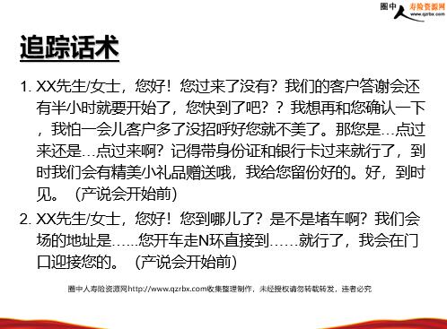未到场客户的电话追踪时机话术与注意事项 大纲 一、追踪重要性二、追踪时机三、追踪话术四、追踪效果评估五、追踪注意事项一场成功的产说会,其决定性因素有很多,会后追踪就是其中之一。作为一名合格的营销人员,不仅要关注、追踪到场客户与签单客户,还必须要注重已邀约但未到场的客户。因为在这些客户中,有些并不一定是因为主观意愿不来,而是由于各种各样的客观原因来不了。那么,我们对这部分客户的追踪就显得至关重要,因为这样既有助于组织举办下次产说会时的客户邀约,也有助于提高本次产说会的保费平台。 情景演练 追踪话术 XX先生/女士,您好!您过来了没有?我们的客户答谢会还有半小时就要开始了,您快到了吧??我想再和您确认一下,我怕一会儿客户多了没招呼好您就不美了。那您是…点过来还是…点过来啊?记得带身份证和银行卡过来就行了,到时我们会有精美小礼品赠送哦,我给您留份好的。好,到时见。(产说会开始前) XX先生/女士,您好!您到哪儿了?是不是堵车啊?我们会场的地址是…...您开车走N环直接到……就行了,我会在门口迎接您的。(产说会开始前) 追踪话术 3.XX先生/女士,您好!您记得之前我邀请您来参加专门为贵宾客户举办的答谢会吗?当时我专门为您预留了一张票,可惜您没到场。在现场,我们为了答谢贵宾客户,每位客户都可凭票领取一份精美礼品,您那份我也帮您留下了,您看您什么时候有时间请我吃顿饭,到时候我好给您,顺便再给您说说现场的情况。(产说会结束后) 4.XX先生/女士,您好!我们在昨天的客户答谢会上聘请了专业讲师对今年的分红以及金融理财形势作了详细的分析报告,我还专门给您留了票和一份挺好的礼品,但是您没来,我觉得可可惜哩。今天我听我们领导说半个月后还要请这个讲师来为贵宾客户做一次报告,您到时候应该有时间吧?好,那我就给您预留一个位子,您来了我把这两次的礼品一并给您,省的您多跑一趟了。(产说会结束后) 效果评估 谢谢