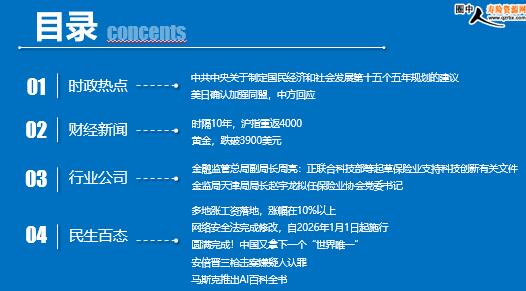 每日新闻速递 2025年10月29日 星期三 目录 时政热点 财经新闻 行业公司 民生百态 中共中央关于制定国民经济和社会发展第十五个五年规划的建议 美日确认加强同盟,中方回应 时隔10年,沪指重返4000 黄金,跌破3900美元 金融监管总局副局长周亮:正联合科技部等起草保险业支持科技创新有关文件 金监局天津局局长赵宇龙拟任保险业协会党委书记 多地涨工资落地,涨幅在10%以上 网络安全法完成修改,自2026年1月1日起施行 圆满完成!中国又拿下一个“世界唯一” 安倍晋三枪击案嫌疑人认罪 马斯克推出AI百科全书 时政热点 中共中央关于制定国民经济和社会发展第十五个五年规划的建议 2025年10月28日 16:41 来源:财联社 2025年10月23日中国共产党第二十届中央委员会第四次全体会议通过 中国共产党第二十届中央委员会第四次全体会议深入分析国际国内形势,就制定国民经济和社会发展“十五五”规划提出以下建议。 美日确认加强同盟,中方回应 2025年10月28日 15:12 来源:财联社 据北京日报,10月28日,外交部发言人郭嘉昆主持例行记者会。 日本电视台记者提问,美国总统特朗普与日本首相高市早苗进行了首次会晤,双方重申要加强美日之间的同盟关系。中方对此有何评论? 郭嘉昆表示,亚太地区是和平发展的高地,美日发展双边关系、开展安全合作,应当有助于维护地区和平稳定,而不是相反。 郭嘉昆强调,由于近代日本军国主义的侵略历史,日本的军事安全动向一直备受亚洲邻国和国际社会的高度关注。今年是中国人民抗日战争暨世界反法西斯战争胜利80周年,我们敦促日方切实尊重周边邻国的安全关切,深刻反省侵略历史,坚持走和平发展道路,以实际行动取信于亚洲邻国和国际社会。