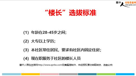 收展组织招募铺垫实施及其工作模式 目录 组织招募铺垫及实施工作模式可行性分析 (1)政府(收展区域大主管&区长)需求点:响应国家号召(政绩)、XX需求(政府形象)、XX市民保险服务需求协调事项:政府文件或通知的形式,告知各居委会及楼长,例:“为相应国家号召,让保险保障走进千家万户,XX市与XX合作,推进保险服务进社区活动…” (2)社区(收展区域大主管&居委会)需求点:提升社区服务品质(提升口碑并增加收入)、更好的保险服务(XX)协调事项:组织楼长会议,告知楼长政府文件,近期将有XX经理联系(铺垫opp)(3)楼长需求点:个人价值实现(为民众信任而服务)、收入需求(普通收入低)、从业优势(客户及增员影响力中心,收展收入模型)沟通事项:在社区铺垫后,邀约楼主参加《楼主opp》 一、进驻前期分析(对象沟通) 提升社区口碑(增加社区收入)社区民众需求(保险服务及理赔进万家) 社区 目的:铺垫伙伴面见! 个人价值(民众的信任&造福民众)个人收入(保险行业收入可观)发展模型(客户、增员资源丰富)楼长 终极目的:邀约OPP! 低收入有时间有资源再创业创说会重点 “楼长”选拔标准 (1)年龄在28-45岁之间;(2)大专以上学历;(3)本社区常住居民,要求有社区内固定住房;(4)现在职服务于社区的楼长人员 目录 组织招募铺垫及实施工作模式可行性分析 保险知识宣传保险问题咨询保单查询服务保单保全服务代办理赔服务办理保险服务 “楼长”的主要工作