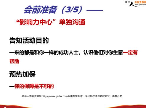 保险高端客户经营之资源共享俱乐部的意义标准及活动流程 资源共享俱乐部的意义 高端客户可以通过这个平台认识更多成功人士,实现资源共享提高代理人的“附加值” 在活动现场创造加保的氛围 资源共享俱乐部的入会标准(1/2) 年龄:35-45岁的成功女性职业:私营企业主年收入100万以上,年缴保费10万以上行业相关联或是有供求关系的行业的同质性客户 资源共享俱乐部的入会标准(2/2) 荣誉感强,注重企业文化,素质高高度认同保险,积极正面性格开朗特别信任代理人 入会标准设定必须与高端客户身份相匹配 资源共享俱乐部活动介绍 活动形式:喝咖啡、喝茶、沐足、郊游、登山等活动频率:每月一次关键词:轻松、自由、快乐 活动 筛选会员 —优选符合条件的高端老客户10人锁定“影响力中心”1-2个 —经济独立,特有主见;做事果断、行动力强 —初步判断,有加保空间 会前准备(1/5)—— 选人 会前准备(2/5)—— 2个“影响力中心” G女士:41岁,私企老板兼老公公司财务总监,家庭年收入超过X万 C女士:42岁,车行老板,年收入千万 告知活动目的 —来的都是和你一样的成功人士,认识他们对你生意一定有帮助预热加保 —你的保障是不够的 会前准备(3/5)—— “影响力中心”单独沟通 会前准备(4/5)—— 选场地、选时间 活动:沐足时间:12.31晚上8:30-10:30 场地:新开张价格便宜、环境优美感觉好、大包间围坐一圈好交流(10-12人) 提前2天通知: —好久没有休闲了,我们安排去洗个脚,大约在后天下午到晚上,你一定要抽出时间来参加。我会带两个与你一样成功的朋友和你认识一下,对你生意一定有帮助。我只是起到穿针引线的作用,以后就靠你自己