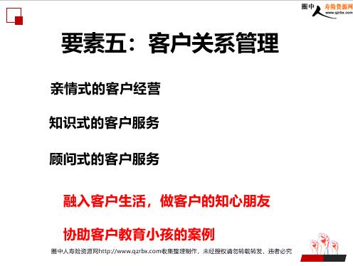保险个人成长之成功的八大要素 财务自由专业人士 要素一:成功信念 希望通过自己的努力成为一个得到社会认可、他人尊重的成功人士 1.只有做到100万才算是销售高手 为什么要成为百万精英? 2.只有做到100万才能赢得尊重 3.只有做到销售高手才能实现高点起步 4.只有做到100万才能实现父母和自己的高品质生活 要想实现百万目标,就必须走进中高端市场,作为新人怎样才能实现在最短的时间内走入中高端呢?1.整理名单 电话约访 要素二:主顾开拓 2.电话约访(大数法则,筛选喜欢我的人) 3.坚持经营、锲而不舍 要素三:个性化的销售行为要素四:成交后的销售 简单相信立刻行动 要素五:客户关系管理 亲情式的客户经营 知识式的客户服务 顾问式的客户服务 融入客户生活,做客户的知心朋友 协助客户教育小孩的案例 要素六:自我管理 时间管理事件管理基础管理 1.时间管理: 2.事件管理: 工作严格按计划执行要敢于和客户说“不” 3.基础管理: 准时出勤—严格要求自己,为组员树立榜样;参加晨会—晨会是我的血液和氧气;每日五访—结交朋友、积累客户;认真记录—填写工作日志是一种享受;及时总结—人生经历的 坚持这些习惯37天,它们就会在思想里扎根,成为个性的一部分,成为成功的助动力! 要素七:正确学习 内部学习、专业资料等随时阅读网上学习向客户学习 网上学习 经常访问的网站财经网站新闻网站军事、历史等 要素八:平衡人生 每月探望一次父母做自己喜欢做的事情就是平衡的人生 谢谢