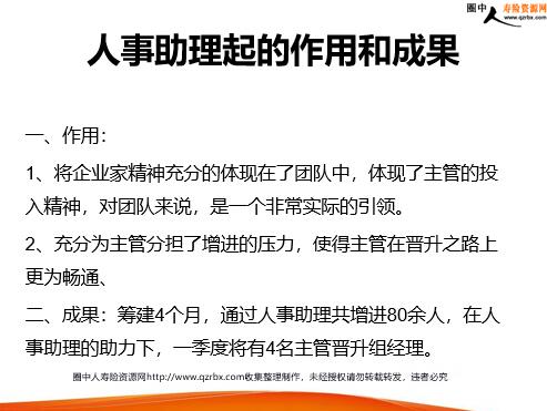 保险团队经营之人事助理的工作管理与作用 人事助理的招聘 一、人事助理在团队中的地位:在各自的团队中为主管的副手,负责整个团队的人力目标。同时共同组成收展部的增员功能组。二、由人事助理的地位决定,人事助理的聘用多为主管的缘故、同学为主。三、人事助理不仅负责团队的增进工作,而且熟知主管的晋升路径,贴心为最好,建议缘故招聘为主。人事助理的工作 1、常态化增员——网络增员,每人每天40个左右的增员电话。 2、人才市场增员:每周3次人才市场招聘,不影响网络电话的拨打 3、校园招聘:助理与各大高校就业.....。 4、集中性增进:每周四创业说明会,不定期去大学召开创业说明会 5、缘故:同学。 6、增员生活化:微信、陌陌、附近的人等一切工具人事助理的管理 一、严格考核每人每日邀约面试量。二、人事助理除转化为主管的以外,随主管的晋升而晋升为初级助理、中级助理、高级助理。薪资待遇随之提升。三、方案激励:X月X日举行了金牌助理评选方案,截止到X月末成功先增进5人,获得金牌助理称号,主管现金奖励。人事助理起的作用和成果 一、作用: 1、将企业家精神充分的体现在了团队中,体现了主管的投入精神,对团队来说,是一个非常实际的引领。 2、充分为主管分担了增进的压力,使得主管在晋升之路上更为畅通、二、成果:筹建4个月,通过人事助理共增进80余人,在人事助理的助力下,一季度将有4名主管晋升组经理。可操作性 一、收展团队质态以应届毕业生为主,同时找工作的同学比较多,进行缘故招聘比较简单。二、聘用人事助理就是践行企业家精神的第一步,是对下属组员的无形引导。三、收展的主管都是男生,人事助理都是女生,阴阳协调,事半功倍。四、新筹建部门可以从聘用公司直属人事助理开始,同时可以争取公司的费用支持。 谢谢
