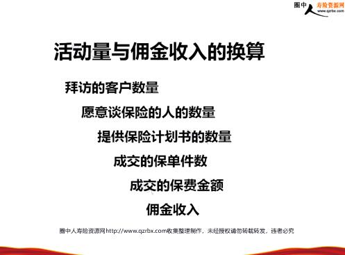 收入的决定因素及其与活动量的换算 决定收入的因素活动量与收入的换算课堂练习 主要内容 决定收入的因素 收入=活动量 ╳(专业知识+技巧) 一、所寻找的准客户数量二、拜访准客户的次数 三、向客户提出成交次数的多少 四、战胜客户拒绝的次数 五、拥有老客户的数量 决定收入的因素活动量与收入的换算课堂练习 主要内容 活动量与佣金收入的换算 拜访的客户数量愿意谈保险的人的数量提供保险计划书的数量成交的保单件数成交的保费金额佣金收入决定收入的因素活动量与收入的换算课堂练习 主要内容 课堂练习 月总访客户量=日平均拜访量×本月天数愿谈保险的客户数量=月总访客户量×50% 提供保险计划书的客户量=愿谈保险客户量×35% 成交的保单件数=提供保险计划书的客户量×35% 成交的保费金额=成交保单件数×2000元月佣金收入=成交的保费金额×平均佣金比例(20%)结语 成功取决于您在市场上亮相的次数 谢谢