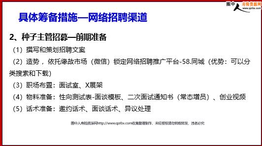 增员招募的目标规划及具体筹备措施 主要内容 建模说明 具体措施 目标规划 团队情况:零基础筹建期招募渠道:网络市场和缘故渠道种子主管筹备期:截止X月X日招聘职务:种子主管8名(建立竞争机制,根据末尾淘汰制实现5名主管留存)出发点:在短时间内筹建收展团队,网络招聘能够定向招聘,辅以缘故渠道,快速甄选出适合的人选符合高起点的宗旨 建模说明 1、招募增员以“有效扩张、量质并举”为基本策略,建成一支初具规模、质态优良、管理规范、特色鲜明的新型队伍(1)、筹建初期选拔意愿强、素质高的骨干,建立不少于8人的筹备主管团队,并引入竞争淘汰机制。充分激发筹备主管工作的主动性和积极性。根据团队筹建情况实行末位淘汰制。最终实现5位主管的稳定的筹备主管团队,此后根据基本法考核要求大量选取后备主管,重点培养,强力扩充主管团队. (2)、拓宽渠道。充分利用网络招聘、招聘会、社区招募、1+1模式等各类招聘渠道扩大增员的入口,在放量的前提下做到质的提升。以主管为点,以点带面,实现主管增员,新人增员,全员增员的爆破式增员。 具体筹备措施 2、种子主管招募—前期准备(1)撰写和策划招聘文案(2)造势,依托缘故市场(微信)锁定网络招聘推广平台-58.同城(优势:可以分类搜索和下载)(3)职场布置:面试室、X展架(4)物料准备:性向测试表-面谈模板、二次面试通知书(常态增员)、创业视频(5)话术准备:邀约话术、面谈话术、异议处理 具体筹备措施—网络招聘渠道 2、种子主管招募—招募流程(1)发布职位推广信息(2)资料的筛选和下载(3)面试通知,目标:30通电话沟通(4)面试沟通会:统一时间,面试前开沟通会,公布面试规则,面试职位和数量(小于面试数,营造竞争氛围),公布淘汰规则,填写性向测试表,随机抽号进行面试;(5)面试面谈-根据性向测试表进行逐一的面谈(6)领导面谈:种子主管由分管总亲自进行二次面谈 3、建立功能组(筹备初期)经过筹备初期的种子主管团队的组建。由所有种子主管组建成为本公司的增员功能组,具体职责如下:(1)、电话邀约:由推荐人拨打邀约电话,种子主管拨打确认电话(或团队人员互助拨打确认电话);(2)、面试官:由推荐人的主管担任;(3)、接待人员:由各种子主管担任(或组内人员担任);(4)、二面试官:筹备负责人担任; 4、量化考核--每月增员量化每月底线面试20人。每月底线入司3人。每周创说会底线参与人数8人 ...........