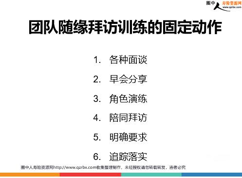 保险客户经营之随机拜访的意义与流程 如果不做保险,我们需不需要结交朋友? 结交朋友是生活方便的前提! 广开客源是生意兴隆的保证! 随缘拜访的定义 不增加成本、不多花费时间,随时随地结交朋友、收集名单 随缘拜访的意义 每天欣赏都市最亮丽的风景线,结交新的朋友每天都有新的感觉、新的收获每天充满期待,享受乐趣! 随缘拜访的流程 主动观察并选定有“眼缘”的人拉近与对方的距离创造与对方沟通的机会索取名单和资料为下次见面做好铺垫持续经营 随缘拜访不仅让我们收获了快乐与幸福,也成就了我们的事业! 将随缘拜访 复制到团队 各种面谈早会分享角色演练陪同拜访明确要求追踪落实 团队随缘拜访训练的固定动作 1.各种面谈增员面谈:把随缘拜访作为部门特色与增员对象沟通,激发兴趣、树立信心新人面谈:入司第一天,与新人一起确认主顾开拓的方式,引入随缘拜访的概念 2.早会分享自己和团队成员随缘拜访的成功案例次日早上八点早早会分享 3.角色演练先让团队成员对案例的整个流程进行点评然后新人做业务员,主管做客户,将分享内容做实战演练演练后先肯定鼓励,增强新人信心,再指出不足 4.陪同拜访新人入司第一周,带新人展业,让其观摩随缘拜访的全过程事后请新人谈观摩感受将流程分解到每一个环节请新人随机做一次随缘拜访,及时鼓励并总结 5.明确要求了解新人当日拜访路线要求做“3”个提前提前1站下车提前半个小时达到提前准备资料在目的地附近做2个以上有效的拜访 6.追踪落实次日再追踪昨日拜访情况将收集到的名单分类分别制定后续经营方案做好客户档案的整理善用资源、长期经营直至签单 做好6+6,就能提升新人定着,让团队持续成长!
