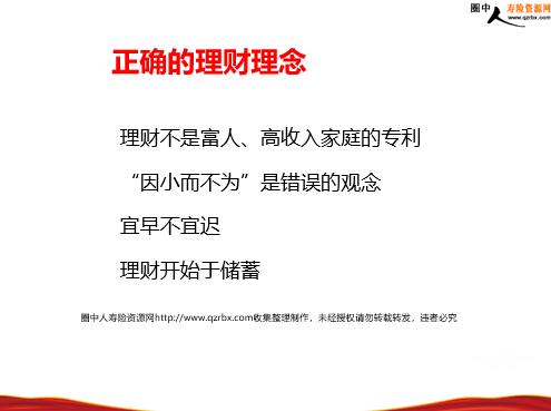 保险理念之理财观念与知识 何为理财 何谓理财 所谓理财就是对个人(家庭)的财务进行科学的、有计划的、系统的全方位管理以实现个人财产的合理使用和消费、有效地保值增值。怎样理财 怎样理财 建立理财的理念确立理财的目标运用理财的工具规避常见的风险坚守理财的原则 正确的理财理念 理财不是富人、高收入家庭的专利 “因小而不为”是错误的观念宜早不宜迟理财开始于储蓄 理财的目标 保证资金安全获得资产增值为未来做准备 理财的工具 常见的风险 投资不当过度消费高额税收通货膨胀人生风险 投资不当 过度消费 高额税收 个人所得税利息所得税印花税 遗产税赠与税物业税 通货膨胀 人生风险 算得出利息算不出风险 理财应遵循的四个原则 分散理财原则知已知彼原则平衡原则 “4321”法则 不要把鸡蛋放在一个篮子里 分散理财原则 知己知彼原则 平衡原则 安全性收益性流动性