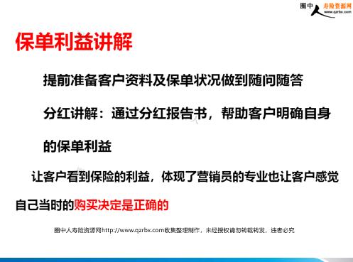 保险客户经营之私营业主的保单分析及开拓重点 客户保单分析客户开拓重点目录 重点筛选30多名私营业主,100%邀约见面 她们的共同点 经济基础好,资产千万以上经营店面多、家境殷实女性居多,多数是南方人感性、易于沟通投资面广泛,各行各业均有生意种类繁多 第一类:对保险的认知度不够 买保险是现在账面上扣掉的钱,而不是自己未来的保障保险只管生老病死,不了解保险其他的金融功能客户购买保险后暴露的三类问题 第二类:保单配置不合理 购买的产品比较单一基本为年金分红险为主无附加医疗,保险体验差件均低保障与实际需求不匹配保费偏低保额缺口大第三类:对保险的售后服务不满意 抱怨前期服务承诺没兑现红利通知书、发票不能及时送达服务缺乏连续性服务人员变动频繁 市场潜力无限,突破口就是完善客户服务 客户服务是改变客户认知的出发点和关键点 客户保单分析客户开拓步骤目录 步骤一: 解决客户遗留问题,重新建立良好关系 递送发票、分红单保单利益讲解了解客户后续服务需求递送发票、分红单核对信息:帮助客户确认信息是否正确变更信息:及时帮助客户更改相关信息核对交费:确认银行账号是否变更 通过以上动作使客户相信公司,知道自己保单一直受公司关注 保单利益讲解提前准备客户资料及保单状况做到随问随答分红讲解:通过分红报告书,帮助客户明确自身的保单利益让客户看到保险的利益,体现了营销员的专业也让客户感觉自己当时的购买决定是正确的