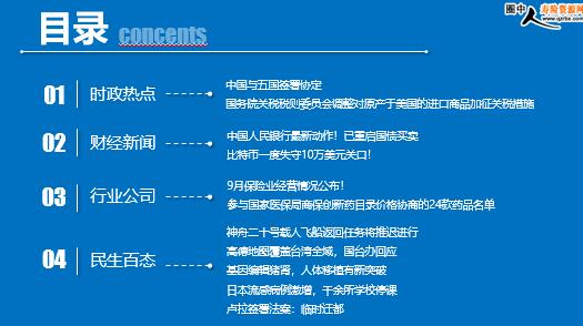 每日新闻速递 2025年11月6日 星期四 目录 时政热点 财经新闻 行业公司 民生百态 中国与五国签署协定 国务院关税税则委员会调整对原产于美国的进口商品加征关税措施 中国人民银行最新动作!已重启国债买卖 比特币一度失守10万美元关口! 9月保险业经营情况公布! 参与国家医保局商保创新药目录价格协商的24款药品名单 神舟二十号载人飞船返回任务将推迟进行 高德地图覆盖台湾全域,国台办回应 基因编辑猪肾,人体移植有新突破 日本流感病例激增,千余所学校停课 卢拉签署法案:临时迁都 时政热点 中国与五国签署协定 2025年11月5日 10:05 来源:环球网 中国与多个太平洋岛国签署《提升经济伙伴关系框架协定》 11月4日,商务部部长王文涛与密克罗尼西亚联邦资源和发展部部长秋永,基里巴斯旅游、商务、工业和合作部部长里特,瑙鲁磷酸盐矿部部长托马,瓦努阿图外交、国际合作与对外贸易部部长阿蒂,斐济贸易、合作社、中小微企业和通信部常秘阿里举行集体会见。会见后,王文涛部长与五国代表分别签署《提升经济伙伴关系框架协定》(简称《框架协定》)。 国务院关税税则委员会调整对原产于美国的进口商品加征关税措施 2025年11月5日 11:54 来源:环球网 今天,国务院关税税则委员会发布关于调整对原产于美国的进口商品加征关税措施的公告,详情如下: 为落实中美经贸磋商达成的成果共识,根据《中华人民共和国关税法》、《中华人民共和国海关法》、《中华人民共和国对外贸易法》等法律法规和国际法基本原则,经国务院批准,自2025年11月10日13时01分起,调整《国务院关税税则委员会关于对原产于美国的进口商品加征关税的公告》(税委会公告2025年第4号)规定的加征关税措施,在一年内继续暂停实施24%的对美加征关税税率,保留10%的对美加征关税税率。