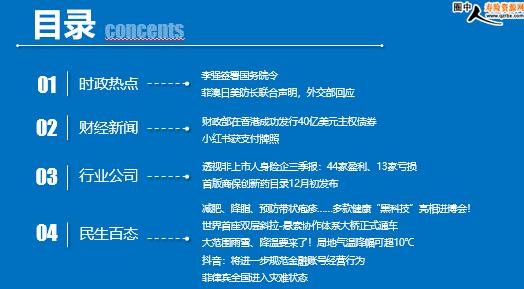 每日新闻速递 2025年11月7日 星期五 目录 时政热点 财经新闻 行业公司 民生百态 李强签署国务院令 菲澳日美防长联合声明,外交部回应 财政部在香港成功发行40亿美元主权债券 小红书获支付牌照 透视非上市人身险企三季报:44家盈利、13家亏损 首版商保创新药目录12月初发布 减肥、降脂、预防带状疱疹……多款健康“黑科技”亮相进博会! 世界首座双层斜拉-悬索协作体系大桥正式通车 大范围雨雪、降温要来了!局地气温降幅可超10℃ 抖音:将进一步规范金融账号经营行为 菲律宾全国进入灾难状态 时政热点 李强签署国务院令 2025年11月6日 17:22 来源:证券时报 新华社北京11月6日电 国务院总理李强日前签署国务院令,公布《生态环境监测条例》(以下简称《条例》),自2026年1月1日起施行。 《条例》旨在规范生态环境监测活动,提升生态环境监测能力和水平,保障生态环境监测数据质量,更好发挥生态环境监测在支撑生态文明和美丽中国建设、服务经济社会高质量发展中的重要作用。《条例》共7章49条,主要规定了以下内容。 菲澳日美防长联合声明,外交部回应 2025年11月6日 17:15 来源:财联社 据央视新闻,11月6日,外交部发言人毛宁主持例行记者会。针对菲律宾、澳大利亚、日本和美国四国防长在东盟防长扩大会期间会晤并发表涉东海和南海的联合声明,毛宁表示,有关国家在涉海问题上炒作虚假叙事,无端攻击指责中国,中方对此强烈不满、坚决反对。 当前东海、南海局势总体保持稳定,有关方面应尊重地区国家通过对话协商妥处涉海问题、维护地区和平稳定的努力,停止借涉海问题挑动争议,加剧紧张。至于“南海仲裁案”,完全是一出披着法律伪装的政治闹剧,目的就是搅乱南海,从中谋利,所谓“裁决”是非法的、无效的,没有拘束力,中方从一开始就不接受、不承认。 亚太是合作发展的高地,不是地缘博弈的棋局。搞集团政治和阵营对抗不会带来和平与安全,不利于亚太和世界的稳定。