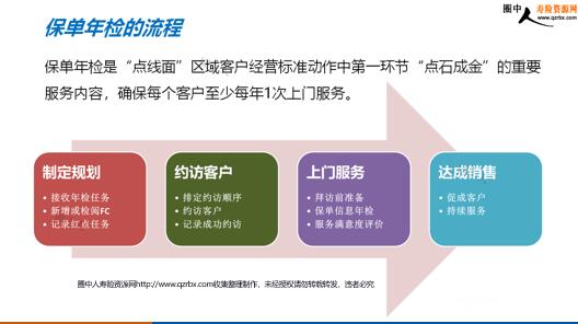 保单年检的流程四步骤 保单年检概述 通过移动保全,每年对客户保单信息进行一次集中的核对、变更,保持客户粘度。 服务资格:入司满1个月,且入区年检对象:一年之内没有做过保全修改的客户(含孤儿单及自有客户) 保单年检的流程 保单年检是区域客户经营标准动作中第一环节的重要服务内容,确保每个客户至少每年1次上门服务。 制定规划 约访客户 上门服务 达成销售 制定规划:梳理本月公司系统推送的保单年检任务,排定拜访优先顺序。 制定规划 时间:每月名单下发后的3天内标准动作:打开行销系统,接收公司推送的保单年检任务。 制定规划 红点任务接收界面(公司推送必须完成的任务): 交费提醒、给付通知、生日提醒、活动通知、保单年检、分红报告 制定规划 确定拜访顺序: 1、熟悉的老客户或缘故客户优先拜访并确定本月销售目标 2、新增的客户详细制作卡后研究确定拜访策略 约访客户:按照红点任务,进行电话邀约。邀约成功后,记录拜访时间 约访客户 时间:每周一步骤: 1、按既定顺序拿出保单年检任务 2、拿起电话,逐一邀约。 3、邀约成功,记录拜访时间和地点,并发送短信 4、约访完成后,统一记录在系统备忘录模块,生成拜访行事历。 约访客户 【第一步:确认客户信息,建立信任】(供参考,可修改)专员:您好!请问是xx先生/女士吗?请问您现在说话方便吗?客户:是的,哪位?专员:您是否在X年X月投保了我司的xx保险?客户:是的,你怎么知道?专员:我是公司指派您所在区域的服务专员,我叫xx,工号xx,感谢您选择我们公司的产品。您X年就为您的孩子投保了教育保险(以核对保单信息获取信任),那么早就为孩子的未来做好合理的规划,您真是位有责任感有远见的好家长(赞美进一步取得信任)【第二步:运用利他原则,提出服务邀约】(供参考,可修改)专员:为了确保您将来在现金领取、理赔时能及时有效,也为您提供更加全面的保单增值服务,公司委派我对您的保单进行一年一度的信息更新与完善(就像每年的身体检查一样/车辆的年检一样)。您是周三下午还是周四上午有空?客户:这样啊,那就周三吧。