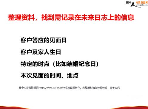 保险个人成长之工作日志记录未来的操作流程 业绩持续成长,源自4个坚持: 坚持出勤坚持拜访坚持认真填写工作日志坚持计划与总结 坚持认真填写工作日志最重要! 准客户的丢失,改变了我记录工作日志的习惯: 记录现在,更记录未来 丢失客户带给我的启发: 如果把客户重要的信息记录在未来的工作日志上,客户就不会丢失了! 从此我开始记录未来…… 记录未来操作流程 记录当天拜访情况: 约定的日期(几周后、几月后)特定的数字(客户生日、年交保费)家庭状况与客户交流的主要语句客户的反应 整理资料,找到需记录在未来日志上的信息 客户答应的见面日客户及家人生日特定的时点(比如结婚纪念日)本次见面的时间、地点 将相关信息登记在未来某天的工作日志上 备足一年的工作日志找到需要登记的日期,提前5到10天,进行标注相关内容最长可以记录一年以上 每月月初整理已经记录的信息 按计划行动 每月30日,整理、汇总本月信息查阅过去的日志记载制定邀约、拜访计划 记录未来的好处: 不记录未来 记录未来 遇到客户推脱没办法经常忘记客户资料没有见客户的理由准客户少 自己诚信,客户感动客户情况很清楚按客户定的时间见面一年后还有客户在等 种瓜得瓜,种豆得豆记录未来,收获未来 谢谢