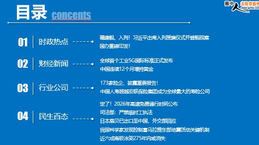 每日新闻速递 2025年11月8日 星期六 目录 时政热点 财经新闻 行业公司 民生百态 福建舰,入列!习近平出席入列授旗仪式并登舰视察 国办重磅印发! 全球首个工业5G国际标准正式发布 中国连续12个月增持黄金 173家险企,披露重要报告! 标普全球寿险公司50强发布:中国人寿超越安联保险集团成为全球最大的寿险公司 定了!2026年高速免费通行时间公布 司法部:严禁临时工执法 日本扇贝已出口至中国,外交部回应 我国科学家发现控制喜马拉雅东部地震活动关键机制 近六成南极冰架275年内或消失 时政热点 福建舰,入列!习近平出席入列授旗仪式并登舰视察 2025年11月7日 13:08 来源:财联社 据央视新闻,我国第一艘电磁弹射型航空母舰福建舰入列授旗仪式5日在海南三亚某军港举行。中共中央总书记、国家主席、中央军委主席习近平出席入列授旗仪式并登舰视察。十一月的三亚,海阔天高,碧波浩瀚。军港内,福建舰踏海而立、满旗高悬,山东舰伏波相伴,来自海军部队和航母建设单位的代表2000余人在码头整齐列队,气氛隆重热烈。 下午4时30分许,入列授旗仪式开始,全场高唱中华人民共和国国歌,五星红旗冉冉升起。仪仗礼兵护卫着八一军旗,正步行进到主席台前。习近平将八一军旗授予福建舰舰长、政治委员。福建舰舰长、政治委员向习近平敬礼,从习近平手中接过八一军旗。习近平同他们合影留念。入列授旗仪式在中国人民解放军军歌声中结束。 国办重磅印发! 2025年11月7日17:48 来源:证券时报 日前,国务院办公厅印发《关于加快场景培育和开放推动新场景大规模应用的实施意见》(以下简称《意见》),对相关工作作出部署。 《意见》指出,场景是用于系统性验证新技术、新产品、新业态产业化应用以及配套基础设施、商业模式、制度政策的具体情境,是连接技术和产业、打通研发和市场的桥梁,是推动科技创新和产业创新融合发展的重要载体,对促进新技术新产品规模化商业化应用具有重要牵引作用。