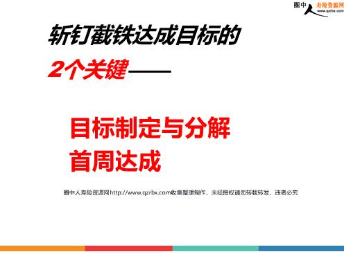 保险团队经营之 达成目标的理解与两个关键 目标是团队的尊严和荣誉,是衡量团队优秀与平庸的标尺 团队必须有明确的目标,并斩钉截铁达成目标! 对斩钉截铁达成目标的理解—— 首周达成月月达成季季达成年年达成 斩钉截铁达成目标的 2个关键—— 目标制定与分解首周达成 年目标=中支公司下达指标×120%季目标=年目标×35%月目标=季目标×35%首周目标=月目标×35% 目标制定与分解 绩效面谈定期用数据分层级谈团队有目标,更有信心始终贯穿于团队经营中 季度目标分解—— 季度目标具体化—— 目标就是晋升目标就是荣誉目标就是收入固定时间和地点-每月26号下午职场内固定流程-分解到部:高经会议自领目标-分解到组:业经自报目标,高经对不合理的目标及时调整,要求当天分解到每个人-高经第二天早会抽查-固定工具:目标分解表,一式两份 月度目标分解 月度目标分解表 目标分解原则-一旦分解,必须斩钉截铁达成-防止“口号”目标小组有缺口,主管承担部门有缺口,直辖组承担全辖有缺口,直辖部承担 首周目标-活动率:主管100%,全员40%-标保:全月的35%首周举措-严抓出勤、高频次职场小型产说会-上月挂零人员必须开单-关帐点小结、业绩补差