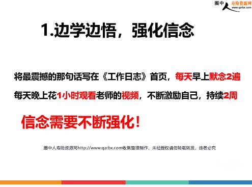 保险个人成长之建立自信3步曲 建立自信3步曲—— 边学边悟,强化信念看清自我,审视高端持续实践,信心倍增 1.边学边悟,强化信念 将最震撼的那句话写在《工作日志》首页,每天早上默念2遍每天晚上花1小时观看老师的视频,不断激励自己,持续2周信念需要不断强化! 2.看清自我,审视高端 找到我们的内心财富看完视频,夜深人静,独自思考,写出20多条自立自强我们从事的是最有挑战性的行业 专业成长特有的专业培训、分享文化助持续成长《习惯》《时间管理》等课程受到客户欢迎工作意义 “人人为我,我为人人”,我们在做慈善事业家庭幸福爱人事业有成,孩子是年级的佼佼者家庭关系和睦,家人以我为骄傲 当找出内心财富后,发现我就是富豪! 重新审视高端客户,找到突破点高端客户只是物质上比我富有高端客户也有担忧企业的持续发展财富保值、增值孩子教育、个人健康家庭关系 我的内心财富与高端客户相匹配 先约访过去不敢约的高端客户每周都要见高端客户面谈时轻松自如 3.持续实践,信心倍增 初次尝试—— 客户背景:夏先生,私营企业主,47岁,转介绍客户 X年X月第一次面谈找不到共同话题,15分钟匆匆结束 X年X月再次见面很轻松地交流2个多小时,虽然没有签单,但是给了我信心 找到内心财富,自信走进高端! 谢谢