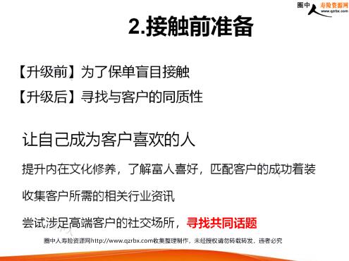 高端客户销售流程五步走 源于销售流程的升级! 高端市场的突破成长, 明确突破方向:开拓高端市场,快速升级客户明确突破技能:同步升级与之相匹配的销售流程 销售流程 1.名单收集 2.接触前准备 3.接触面谈 4.需求分析 5.说明促成 1.名单收集 【升级前】没有标准的随缘【升级后】高端客户定向转介绍 转介绍标准个人年收入30万,家庭年收入50万私营企业主为主 结果收集到12个高端客户 2.接触前准备 【升级前】为了保单盲目接触【升级后】寻找与客户的同质性 让自己成为客户喜欢的人提升内在文化修养,了解富人喜好,匹配客户的成功着装收集客户所需的相关行业资讯尝试涉足高端客户的社交场所,寻找共同话题 3.接触面谈 【升级前】自我设限,仰视对方【升级后】用自信、平等的心态交流 我只是与客户交朋友,“人不求人一般高”,“你只是个人财富比我多”“我有对你有用的资讯” 我也是企业主,也在经营一家年营业额上千万的“企业” 4.需求分析 【升级前】历经2年时间,做了个人第一张大保单,却不知道大单是怎么成交的 思考:对于一个资产过亿的企业主来说,购买了一张7万多元的保单,意味着什么? 不专业:没有匹配客户身价,不能满足实际需求 结论:充分了解高端客户的各种资讯,并按需求来设计适合身价的保障 不用心:没有充分掌握客户信息急于求成:难得一份大单 【升级后】通过了解高端客户特质,挖掘出常见的保险需求 身价体现,满足被尊重的感觉实现个人的财务安全专属于自己的“爱心基金” 5.说明促成 【升级前】没有章法、没有匹配的产品【升级后】推荐专属产品匹配高端市场;一旦挖掘出需求,立即促成 非常忙,很难见得到即使能约见到面,也很难再次营造出有效沟通的氛围视时间为生命,不会肆意浪费洞察力强,一旦判断准确会即刻行动 高端客户具备以下特征是立即促成的原因 一旦谈及保险,立即促成 高端客户也需要保险,只不过他们需要的是专业的理财规划师 谢谢