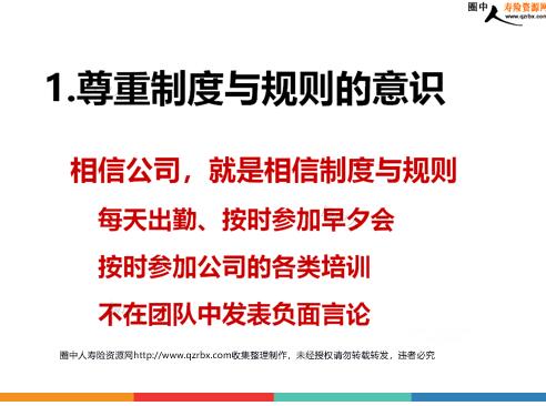 保险新人培训之新人承诺面谈 个人业绩与团队业绩同步成长,源于一种方法—— 新人承诺面谈! 新人承诺面谈 让新人建立正确的从业意识!让新人设定三个月行动方案! 正确的从业意识 1.尊重制度与规则的意识 2.服从管理、接受辅导的意识 3.正确行为的意识 1.尊重制度与规则的意识 相信公司,就是相信制度与规则每天出勤、按时参加早夕会按时参加公司的各类培训不在团队中发表负面言论 2.服从管理、接受辅导的意识 相信主管新人和主管是师徒关系、家庭关系有烦恼或不如意告诉直接主管和我相信主管是真心希望你成长,接受主管的辅导和建议 3.正确行为的意识 坚信寿险是非常崇高的工作相信大数法则会带给你成功每天填写工作日志 新人入司面谈承诺卡(上联)姓名:性别:年龄:学历:本人承诺:一、相信公司,相信主管,相信寿险意义与功用,相信大数法则;二、每天早晨8:30分按时出勤早会;按时参加公司要求的各项培训;三、每天填写工作日志;每天电话约访___个;每天拜访客户:___个四、三个月转正目标分解:第一月:第二月:第三月: FYP/件数FYP/件数FYP/件数承诺人:证诺人:日期: **营业部 新人承诺面谈工具 业务经理留存 面谈时获得新人承诺,朗读、签字、上墙新人三个月业绩列表上墙 新人入司面谈承诺卡(下联)姓名:性别:年龄:学历:本人承诺:一、相信公司,相信主管,相信寿险意义与功用,相信大数法则;二、每天早晨8:30分按时出勤早会;按时参加公司要求的各项培训;三、准时填写工作日志;每天电话约访___个;每天拜访客户:___个四、三个月转正目标分解:第一月:第二月:第三月: FYP/件数FYP/件数FYP/件数承诺人:证诺人:日期: **营业部 新人留存 谢谢大家!