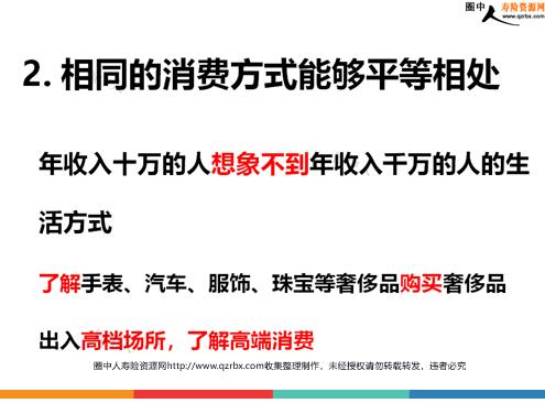 提升自我3个方面走进中高端市场 业绩的提升、突破缘于—— 走进中高端市场 不同客户、不同场合要有相匹配的着装,与消费方式 要在中高端客户面前有尊严的做保险,需要与之对等的身份 对客户:中高端客户更希望有与之匹配的保险服务人员 对自己:不断提升自己,让自己也进入中高端的行列 走进中高端市场的关键—— 自我提升 提升自己的3个方面 1.改变自我形象 2.转换消费方式 3.提升专业能力 1.提升形象是打造自我的捷径 着装:根据客户与场合,选择适合的着装,体现品质与品位 房子:1500元/平方米的普通住宅换成2.6万/平方米的高档小区 车子:标致车换成宝马汽车 2.相同的消费方式能够平等相处 年收入十万的人想象不到年收入千万的人的生活方式 了解手表、汽车、服饰、珠宝等奢侈品购买奢侈品 出入高档场所,了解高端消费 2.相同的消费方式能够平等相处只花几千元买保单的人很难想象有人会花上百万买保单 为自己购买了X万保额的健康险 居住的区域、开的车银行卡、奢侈品待人接物的语言和动作、就餐习惯等 可以根据客户的外在特征判断是否为中高端客户 骑自行车的客户也有可能购买百万保单背奢侈品包的客户也不一定是高端客户开好车的客户也有可能负债累累 还能够识别当中的陷阱 有自己的评判标准,很关注细节欣赏能与自己地位匹配的营销员注重保护自己的隐私 高端客户的内在特质 3.专业是取得认同的最好方式 以前就产品卖产品,主要讲收益讲保障 现在90%的时间沟通理念,10%讲产品,做规划 熟背与保险相关的法徇条款,体现专业