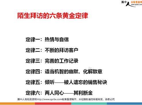 成功陌生拜访的特点方式及其话术 陌生拜访的好处 免费练习,熟练行销流程磨练心志,建立成功心理保证客户来源绵延不断 成功陌生拜访的特点 定时、定点快速筛选持续执行(至少试三个月以上)较强的认同、赞美、拒绝处理能力接触前10秒钟的动作、决定可不可以继续谈下去 陌生拜访的六条黄金定律 定律一:热情与自信定律二:不断的拜访客户定律三:完善的工作记录定律四:适当机智的幽默、化解敌意定律五:倾听——被人遗忘的销售秘诀定律六:两人同心——其利断金你无法赚取报酬,除非你完成交易;你无法完成交易,除非你签下保单;你无法签下保单,除非你面对客户;你无法面对客户,除非你前去拜访。 进行陌生拜访的要领 区域性活动收集目标区域的背景资料编制标准接触话术建议书及说明话术准备推销资料、图片话术背诵及演练陌生拜访客户来源 头脑风暴法(尽量多的去思考可能的客户来源) 陌生拜访的方式 直接拜访随机拜访业务咨询市场调查媒体行销等 话术(一) 直接拜访--敲门先生您好,我是xx的业务代表,这是我的名片,为了提高我公司服务质量,公司特指派我为这个小区作服务调查,请问您买保险了吗?您对我公司的服务还满意吗?…… 客户合作即进行理念沟通……注意要相应记录。客户不合作既礼貌告辞。 话术(二) 随机拜访先生您好,我是xx的业务代表,这是我的名片,能否请教您买保险了吗?客户如回答买了即进行恭喜赞美,询问所买险种进行保险责任的确认,伺机介绍新险种…… 客户如回答没买即询问原因,进行理念沟通和拒绝处理…… 话术三:消除戒心(街头问卷拜访) 先生您好:“我是xx保险公司的市场调查员,正在做保单售后服务品质调查,请问您现在拥有的保单服务满意不满意?”