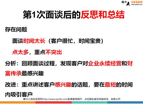 高端客户的特征及其面谈 不敢见高端客户即使见面,也不敢谈保险谈话内容很散,对客户也没有价值 过去的观念—— 过去的动作—— 高端客户很成功,高高在上 不缺名单,但很少转化成客户面谈容易冷场,无法取得认同再次约见难没有自信,没有方法过去的结果—— 对比分析客户的特征及担忧 私营企业主的担忧—— 企业核心竞争力资金链容易断接企业的安全传承 根据客户担忧拟定适合自己的面谈版本(用发问的方式) 最近企业经营状况如何?收益肯定很高吧?怎样看待资金链的问题?(资产安全) 对企业的核心竞争力有信心吗?(永续经营) 有没有考虑企业未来的接班人?(财富传承) 演练通关 演练对象:两位关系很好的老客户,年收入百万以上,曾购买过X万元保单演练结果:客户说“你变化很大”,觉得和我交流有价值,让我找到自信 “专业第一”果然没错! 案例 客户背景:王女士、57岁、私营企业主、家庭年收入400万,认识2年多,从未谈过保险面谈前准备反复默背4个问题,直到脱口而出原本设计5万的xx,但一想到 “心大、胆大、口大”,于是大胆设计了15万的保单 第1次面谈见面就用4个问题向客户提问,顺利切入xx,交流了3个小时,很愉快客户反应:还可以,但是要考虑考虑 第1次面谈后的反思和总结 存在问题面谈时间太长(客户很忙,时间宝贵)点太多,重点不突出分析:回顾面谈过程,发现客户对企业永续经营和财富传承最感兴趣改进:重点讲述客户感兴趣的话题,要在最短的时间内吸引客户