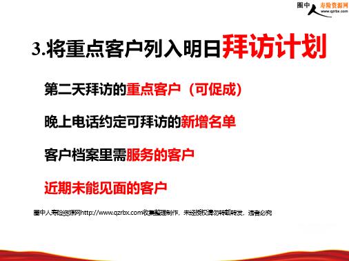 保险个人成长之工作日志记录的时间点与内容 没有工作日志就没有有效跟进没有工作日志就没有后续服务没有工作日志就没有稳定业绩 工作日志记录的3个时点 时点1:早会时间—— 记录大早、二早学习的内容,包括重要理念、重要资讯、故事、好点子、名言警句 时点2:面谈时—— 及时记录易遗忘的信息:如电话号码、生日、转介绍的住址、住院的医院信息…… 做保单整理,登记家庭保单存折 时点3:晚间半小时—— 记录、整理一天拜访情况 记录分析计划准备 客户资料收集:基本情况、年收入、消费情况、兴趣爱好、近期状况等拜访流程记录:客户关心话题、保险需求、异议、不经意提到的朋友信息、再次见面时间、拜访理由等服务项目登记:生日礼物、节日礼品、保全及理赔记录、附加值服务等新增客户(增员)名单记录及转录 详细记录拜访信息 最有价值的客户信息 穿着和配饰(衣服、手表、手机、包、车)生活品味(社区、爱好、运动、娱乐)对投资的关注(股票、基金、房产、保险)子女教育(是否有子女、学校、课外辅导)医疗保健(体检医院) 2.按拜访进度分析客户 根据客户不同拜访进度进行分类,记录在“周总结计划”栏中包括初次收集资料、已明确需求、促成阶段、老客户服务回访、新增名单(包括转介绍、随缘名单) 第二天拜访的重点客户(可促成)晚上电话约定可拜访的新增名单客户档案里需服务的客户近期未能见面的客户 将重点客户列入明日拜访计划 根据计划准备拜访工具 销售辅助工具选择拜访逻辑需要服务的工具