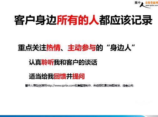 保险客户经营之记录客户身边人的步骤 持续大量的客户,是工作日志记录出来的! 做新人时的一个故事—— 初次见面,留下名片再次见面,遭到对方埋怨第三次电话沟通,坚决抵制保险 每天到处找客户,为什么身边潜在客户却被错过?每天觉得做保险难,为什么身边的签单机会却没有珍惜? 原因—— 忽视对客户身边人的及时记录 关注客户身边人,在工作日志中及时记录相关信息,是确保客户量的关键! 客户工作的地方(同事、员工、客户、同一市场的业主……)客户理赔的地方(医务人员、病友、家属……)客户聚会的地方(同学、朋友……) 所有为客户服务的地方都能找到客户身边人—— 客户身边所有的人都应该记录 重点关注热情、主动参与的“身边人” 认真聆听我和客户的谈话适当给我回馈并提问 容易沟通方便联系 记录客户身边人的好处—— 质量等同转介绍 工具:随身便签本时间:第一次接触时 记录客户身边人的步骤1 ——初次记录 内容姓名、电话、地址、兴趣爱好和客户的关系要点着重观察、简单交流记录重要信息 工具:工作日志时间:当天回到职场后 记录客户身边人的步骤2 ——归纳整理 内容基本信息(姓名、电话、家庭状况、地址……)与客户的关系,性格、喜好需求简单分析(险种、保障大小)拟定拜访计划(如何切入“三讲”)要点及时、不拖延记录工作日志上没有提示的信息 工具:工作日志时间:面谈后回到职场 记录客户身边人的步骤3 ——拜访记录