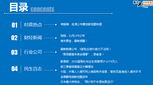 每日新闻速递 2025年11月21日 星期五 目录 时政热点 财经新闻 行业公司 民生百态 特朗普:批准公布爱泼斯坦案档案 刚刚,11月LPR公布 事关黄金,最新提醒! 最新数据公布,5家险企偿付能力不达标! “医保额度年底会清零”,是谣言! 教育部:2026届高校毕业生规模预计1270万人 前三季度结婚登记大幅增加 今起,外国人入境可网上填报相关信息,落地后直接进入通关环节 全国静电指数地图发布 日本最大核电站,“预计将于本周恢复运行” 时政热点 特朗普:批准公布爱泼斯坦案档案 2025年11月20日 09:42 来源:财联社 据央视新闻报道,当地时间11月19日,美国总统特朗普签署法案,批准公布爱泼斯坦案档案。