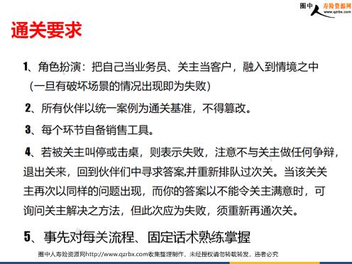 通关的意义流程内容及其注意事项 通关的意义通关的流程和内容通关的注意事项 课程主要内容 一、学习体会金字塔 二、学习过程 知道(做什么) 观察(看怎么做) 做(实践) 总结(是否有进展) 成果(我的收货) 三、结论 “培训”不是听课 而是一个改变行为的过程! 通关的意义通关的流程和内容通关的注意事项 课程主要内容 客户背景 客户来源:缘故客户客户基本信息张先生一家之主32岁私营企业主年收入X万X年在我公司购买X万xx定期保险张太太29岁全职太太没有购买保险张宝贝(儿子)3岁幼儿园小班在早教机构有学习 通关流程 明确自己的通关地点与关主小组内抽签,确定通关顺序进入通关地点问候关主,自我介绍经关主同意后开始进行通关通关成功,关主签名;通关未果,重新排队,直至过关为止通关内容 以xx险销售为主线,考察:一、约访二、面谈 1、我为什么要买保险 2、讲故事说保险 3、买保险选xx 4、在我这里买保险 5、激发需求 6、产品说明(FAB) 7、画图说保险 8、促成及异议处理 9、索取转介绍通关的意义通关的流程和内容通关的注意事项 课程主要内容 通关要求 1、角色扮演:把自己当业务员、关主当客户,融入到情境之中(一旦有破坏场景的情况出现即为失败) 2、所有伙伴以统一案例为通关基准,不得篡改。 3、每个环节自备销售工具。 4、若被关主叫停或击桌,则表示失败,注意不与关主做任何争辩,退出关来,回到伙伴们中寻求答案,并重新排队过次关。当该关关主再次以同样的问题出现,而你的答案以不能令关主满意时,可询问关主解决之方法,但此次应为失败,须重新再通次关。 5、事先对每关流程、固定话术熟练掌握 6、事先对拒绝问题多作准备,至少准备一至二个应对话术 7、每一关都以积极、认真的态度去面对 8、把通关卡作名片,每次都要递上名片。 9、通关卡上所有关主签字后,视为通关结束,请将通关卡交给值班老师后,方可离开。 10、奋斗次数超过3次以上,将不予结训,继续轮训。通关表 关主汇总表 新兵营培训通关关主登记表关名关主日期 注:表现情况分为A优秀、B良好、C合格、D一般四个等级 谢谢