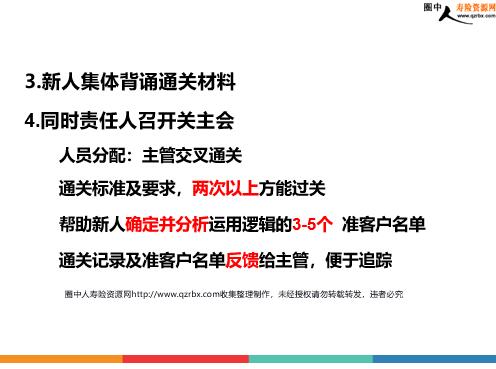 保险新人辅导训练的三个关键环节 新人辅导训练的三个关键环节 衔接训练是新人融入市场最有效的方法营业组早会是主管对新人有效辅导的载体新人夕会是提升新人技能的平台 第1部分—— 衔接训练 培训目的:强化新人培训,推动新人快速上岗并转正时间安排:每天上午8:30—10:00,持续一周培训方式:半训练、半市场实践参加人员:参加过新人培训的新人 一、概要 训前—— 1.成立培训功能小组,每周召开会议确定衔接训练的课程内容及讲师安排 2.高级经理召开衔训训前沟通会介绍衔训目标、内容、讲师,公布参训及要求缓解新人压力,增强新人信心 3.组训短信通知新人、推荐人及主管:参训时间及地点 确保新人出勤 二、操作流程 衔接训练课程表 训中—— 1.课堂训练 2.完成训后作业每天布置训后作业周二:销售流程的通关演练周三:三讲的通关演练周四:根据统一的客户背景,设计产品组合、说明产品利益周五:整理名单并分类组训短信告知推荐人和主管,确保完成主管辅导 训后—— 营业区召开迎新会介绍新人表彰新人:开单上岗、转正、拿到最高底薪 1.高经召开训前会,让新人对衔接训练充满期待,确保新人按时出勤 2.主管辅导新人按时完成训后作业 三、衔接训练的关键点 第2部分—— 营业组早会 一、目的 建立小组文化、增强团队凝聚力了解组员工作进度、交流知识与信息、解决展业问题提升主管组织与辅导能力,提高管理效率 提升主管能力的重要平台 二、常见问题及处理 三、操作流程 会前—— 1.诊断需求:了解组员展业中的主要问题诊断方法观察:陪同、通关演练面谈:询问分析:工作日志、业绩进度、增员进度 2.根据公司业务节奏,确定早会主题,拟定行事历周一上午召开营业区高经会,确定营业区早会行事历周一下午召开营业部主管会,确定营业部早会行事历营业组根据营业部早会行事历和业务节奏确定每周早会行事历 注意事项 ①把控运作节奏上旬:计划、活动量追踪、主顾开拓、产说会、创说会推动、追踪活动率中旬:追踪万元率、技能培训、演练、绩优分享下旬:促成、目标达成、业绩考核 ②拟定早会行事历细化分工,让组员多参与事前与分享人有效沟通,掌控全局,保证效果每周提前公布早会内容