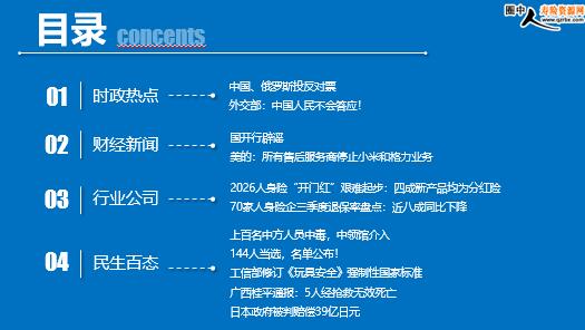 每日新闻速递 2025年11月22日 星期六 目录 时政热点 财经新闻 行业公司 民生百态 中国、俄罗斯投反对票 外交部:中国人民不会答应! 国开行辟谣 美的:所有售后服务商停止小米和格力业务 2026人身险“开门红”艰难起步:四成新产品均为分红险 70家人身险企三季度退保率盘点:近八成同比下降 上百名中方人员中毒,中领馆介入 144人当选,名单公布! 工信部修订《玩具安全》强制性国家标准 广西桂平通报:5人经抢救无效死亡 日本政府被判赔偿39亿日元 时政热点 中国、俄罗斯投反对票 2025年11月21日 15:13 来源:澎湃新闻 据新华社报道,国际原子能机构理事会20日表决通过美国与英国、法国、德国共同推动的伊朗核问题决议。中国、俄罗斯、尼日尔对决议投反对票。 该决议要求伊朗依据联合国要求,向国际原子能机构开放核计划相关场所并提供完整信息。当天,伊朗正式致函国际原子能机构总干事格罗西,宣布开罗协议不再有效,并被伊朗视为终止。伊朗外长阿拉格齐称,这些国家的举动无视伊朗的互动和善意,损害了国际原子能机构的信誉和独立性,并破坏了该机构与伊朗之间的互动与合作进程。 外交部:中国人民不会答应! 2025年11月21日 15:40 来源:环球网 日本首次出口杀伤性武器并讨论修改“无核三原则”,外交部回应 11月21日,外交部发言人毛宁主持例行记者会。 凤凰卫视记者提问,据报道,日本政府日前完成向美国返销“爱国者”防空导弹。这是日方对武器出口“松绑”后,首次出口杀伤性武器。另有消息称,日本自民党开始讨论修订三份安保条约文件,其中包括修改“无核三原则”,增加国防开支等。发言人对此有何评论? 毛宁表示,二战胜利后,《开罗宣言》《波茨坦公告》《日本投降书》等国际法律文件,对日本作为战败国的义务作出了明确规定,包括完全解除武装,不得维持能使其重新武装的产业。然而,日本近年来不断自我松绑,扩张军力,防卫预算13连增,通过了新安保法案解禁集体自卫权,将“武器出口三原则”修改为“防卫装备转移三原则”,不断放宽武器出口限制,甚至开始出口杀伤性武器。