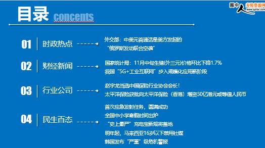 每日新闻速递 2025年11月26日 星期三 目录 时政热点 财经新闻 行业公司 民生百态 外交部:中美元首通话是美方发起的 “俄罗斯发动联合空袭” 国家统计局:11月中旬生猪(外三元)价格环比下降1.7% 我国“5G+工业互联网”步入规模化应用新阶段 赵宇龙当选中国保险行业协会会长! 太平洋保险获批向太平洋保险(香港)增资30亿港元或等值人民币 首次应急发射任务,圆满成功 全国中小学寒假时间出炉 “史上最严”充电宝新规将落地 明年起,马来西亚16岁以下禁用社媒 韩国发布“严重”级危机警报 时政热点 外交部:中美元首通话是美方发起的 2025年11月25日 15:31 来源:环球网 在11月25日外交部例行记者会上,有记者提问称,根据中方发布的消息,昨晚中美元首通了电话,请问这次通话是由中方主动提议,还是应美方邀请进行?另外这次通话持续了多长时间?中方如何评价这次通话的成果? 对此,发言人毛宁表示,特朗普总统第二任期以来,中美元首保持着经常性的交往。据我了解,此次通话是美方发起的,通话的氛围是积极的、友好的、建设性的。两国元首就共同关心的问题进行沟通,对中美关系稳定发展十分重要。 “俄罗斯发动联合空袭” 2025年11月25日 17:31 来源:环球网 乌克兰方面称,当地时间11月25日凌晨,俄罗斯军队使用巡航导弹、弹道导弹以及无人机对乌克兰发动联合空袭。 乌克兰基辅市市长克利奇科25日通报称,截至目前,俄军袭击已造成基辅市6人死亡。基辅市政府通报称,由于基辅市遭俄军袭击,基辅市7个区的居民供暖中断。